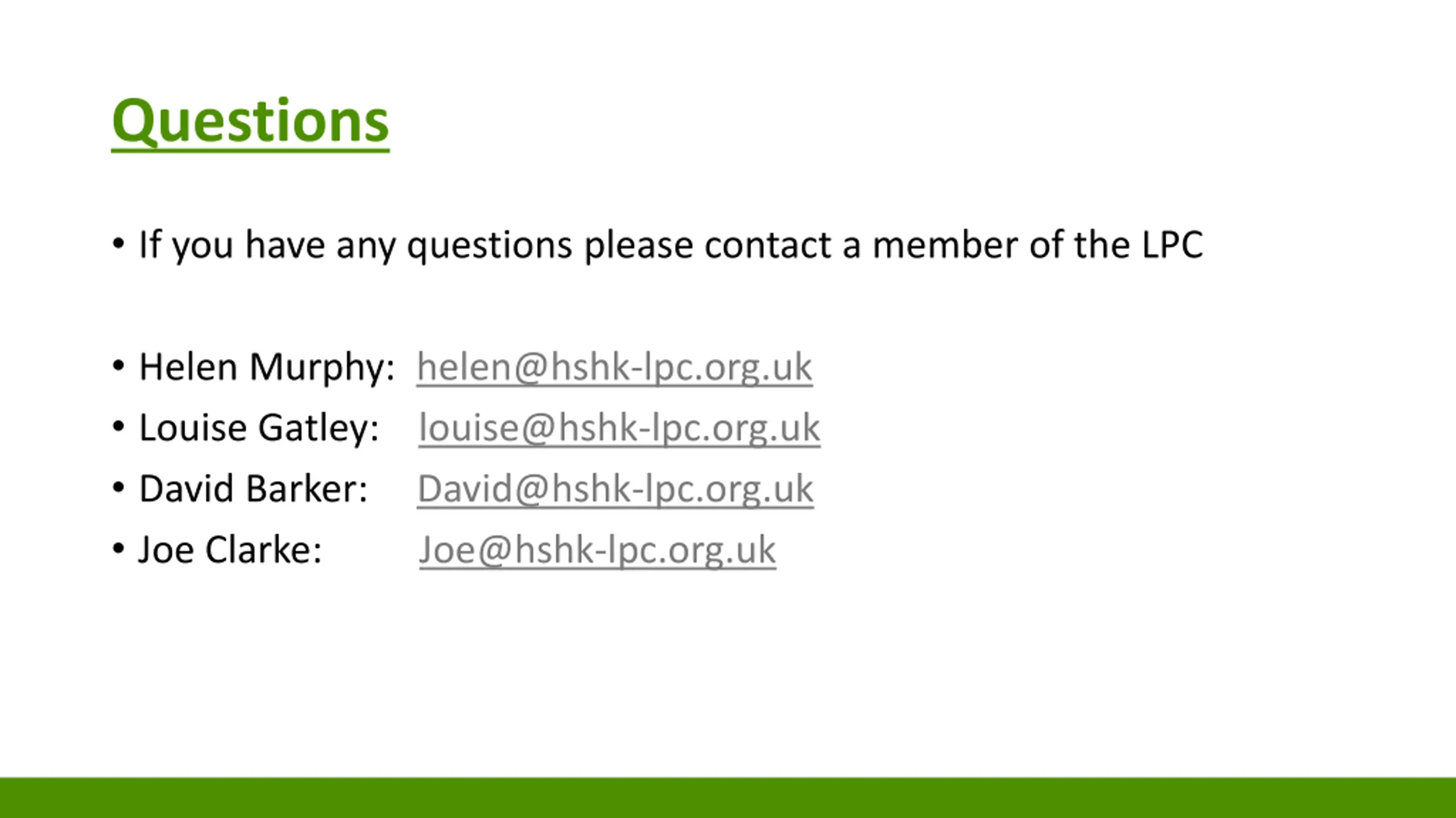 Questions If you have any questions please contact a member of the LPC Helen Murphy: helen@hshk-lpc.org.uk Louise Gatley: louise@hshk-lpc.org.uk David Barker: David@hshk-lpc.org.uk Joe Clarke: Joe@hshk-lpc.org.uk