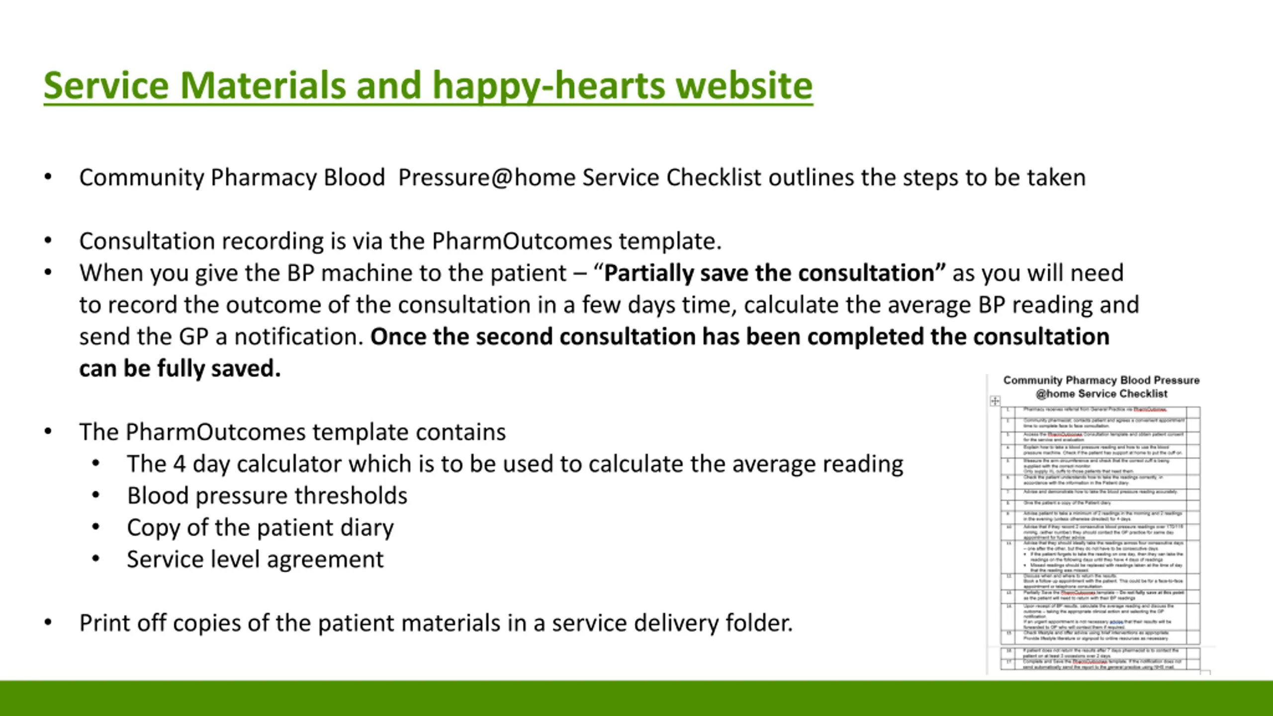 Service Materials and happy-hearts website Community Pharmacy Blood Pressure@home Service Checklist outlines the steps to be taken Consultation recording is via the PharmOutcomes template. When you give the BP machine to the patient Partially save the consultation as you will need to record the outcome of the consultation in a few days time, calculate the average BP reading and send the GP a notification. Once the second consultation has been completed the consultation can be fully saved. The PharmOutcomes template contains The 4 day calculator which is to be used to calculate the average reading Blood pressure thresholds Copy of the patient diary Service level agreement Print off copies of the patient materials in a service delivery folder.