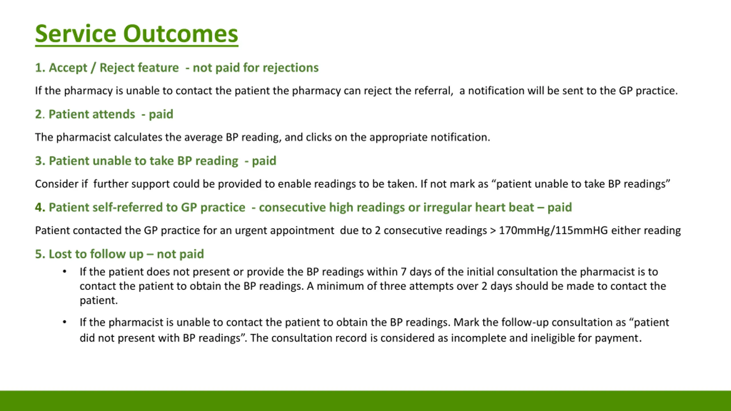Service Outcomes 1. Accept / Reject feature - not paid for rejections If the pharmacy is unable to contact the patient the pharmacy can reject the referral, a notification will be sent to the GP practice. 2. Patient attends - paid The pharmacist calculates the average BP reading, and clicks on the appropriate notification. 3. Patient unable to take BP reading - paid Consider if further support could be provided to enable readings to be taken. If not mark as patient unable to take BP readings 4. Patient self-referred to GP practice - consecutive high readings or irregular heart beat paid Patient contacted the GP practice for an urgent appointment due to 2 consecutive readings > 170mmHg/115mmHG either reading 5. Lost to follow up not paid If the patient does not present or provide the BP readings within 7 days of the initial consultation the pharmacist is to contact the patient to obtain the BP readings. A minimum of three attempts over 2 days should be made to contact the patient. If the pharmacist is unable to contact the patient to obtain the BP readings. Mark the follow-up consultation as patient did not present with BP readings . The consultation record is considered as incomplete and ineligible for payment.