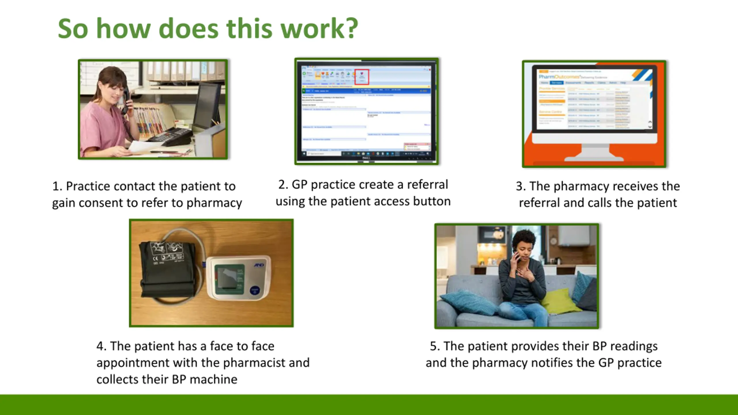 So how does this work? 2. GP practice create a referral using the patient access button 1. Practice contact the patient to gain consent to refer to pharmacy 3. The pharmacy receives the referral and calls the patient 4. The patient has a face to face appointment with the pharmacist and collects their BP machine 5. The patient provides their BP readings and the pharmacy notifies the GP practice