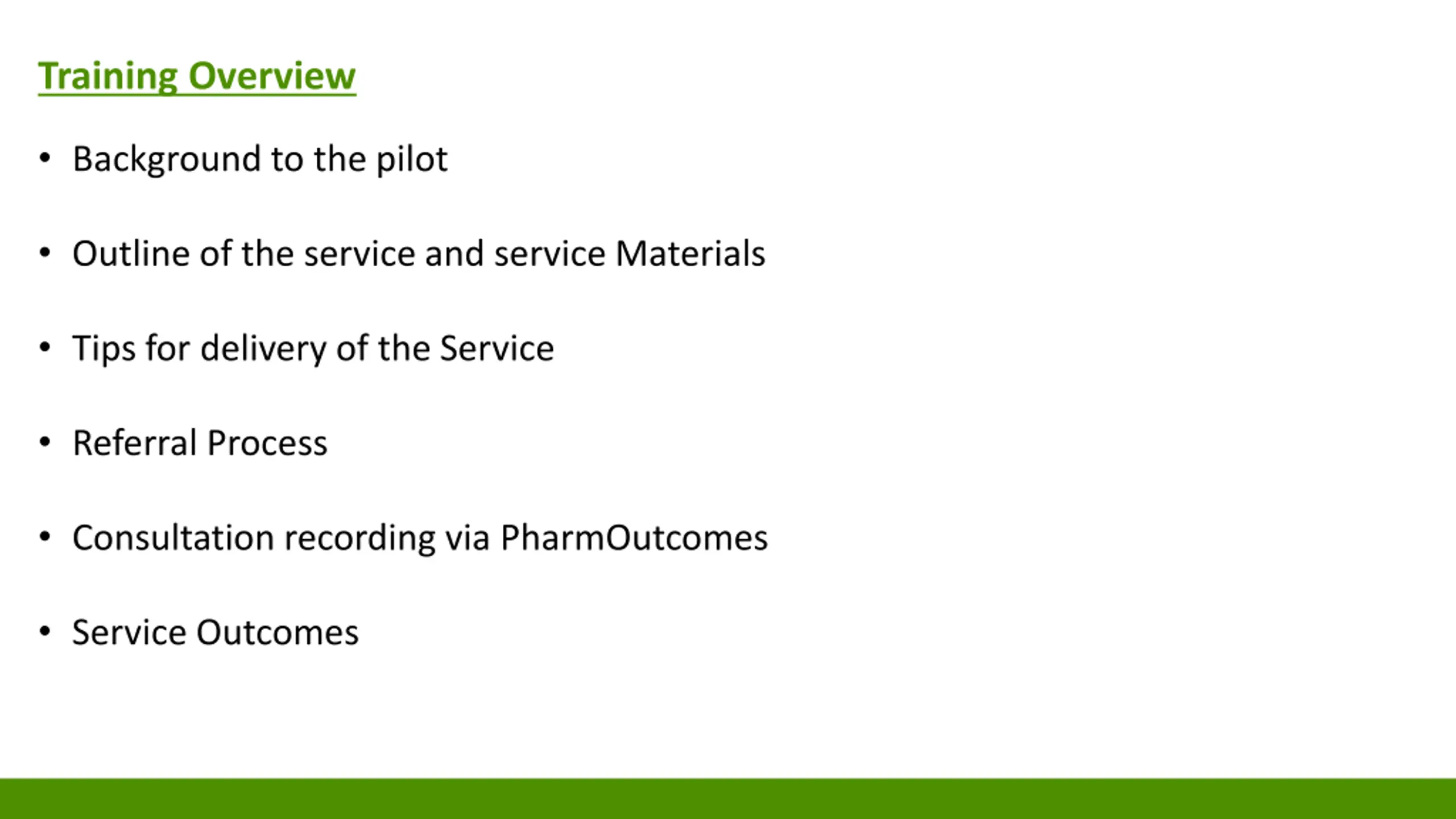Training Overview Background to the pilot Outline of the service and service Materials Tips for delivery of the Service Referral Process Consultation recording via PharmOutcomes Service Outcomes
