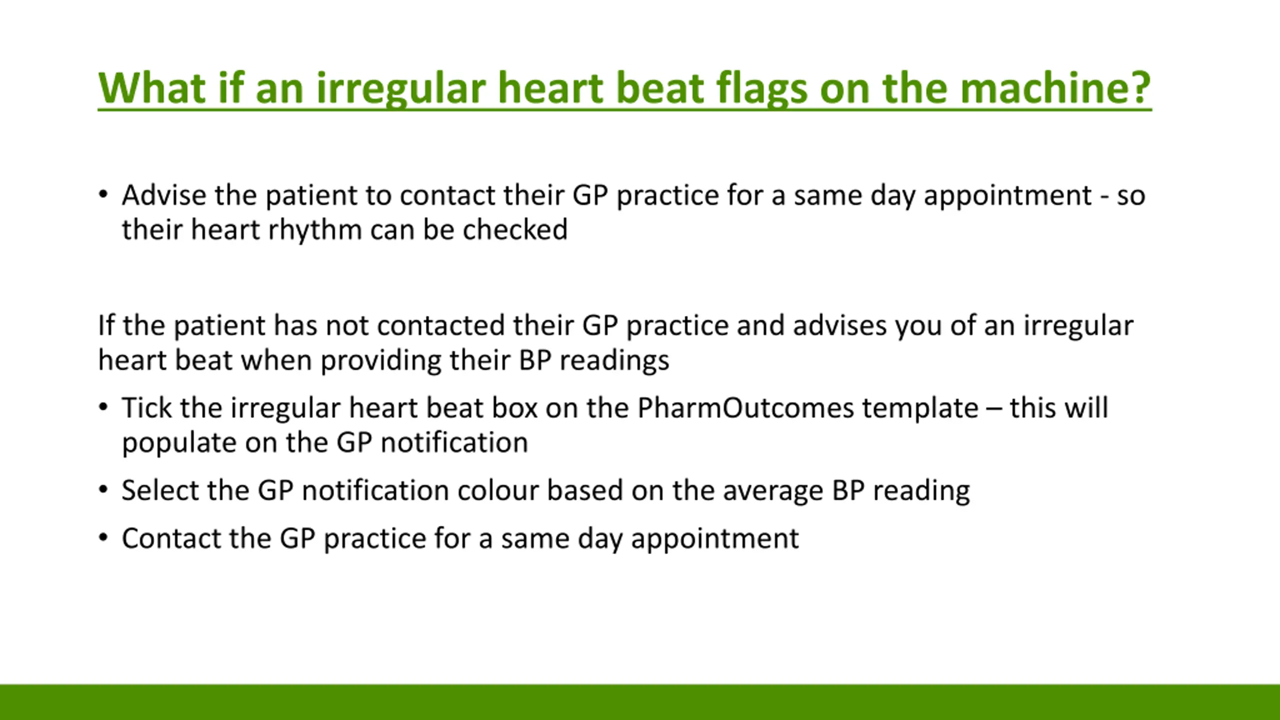 What if an irregular heart beat flags on the machine? Advise the patient to contact their GP practice for a same day appointment - so their heart rhythm can be checked If the patient has not contacted their GP practice and advises you of an irregular heart beat when providing their BP readings Tick the irregular heart beat box on the PharmOutcomes template this will populate on the GP notification Select the GP notification colour based on the average BP reading Contact the GP practice for a same day appointment