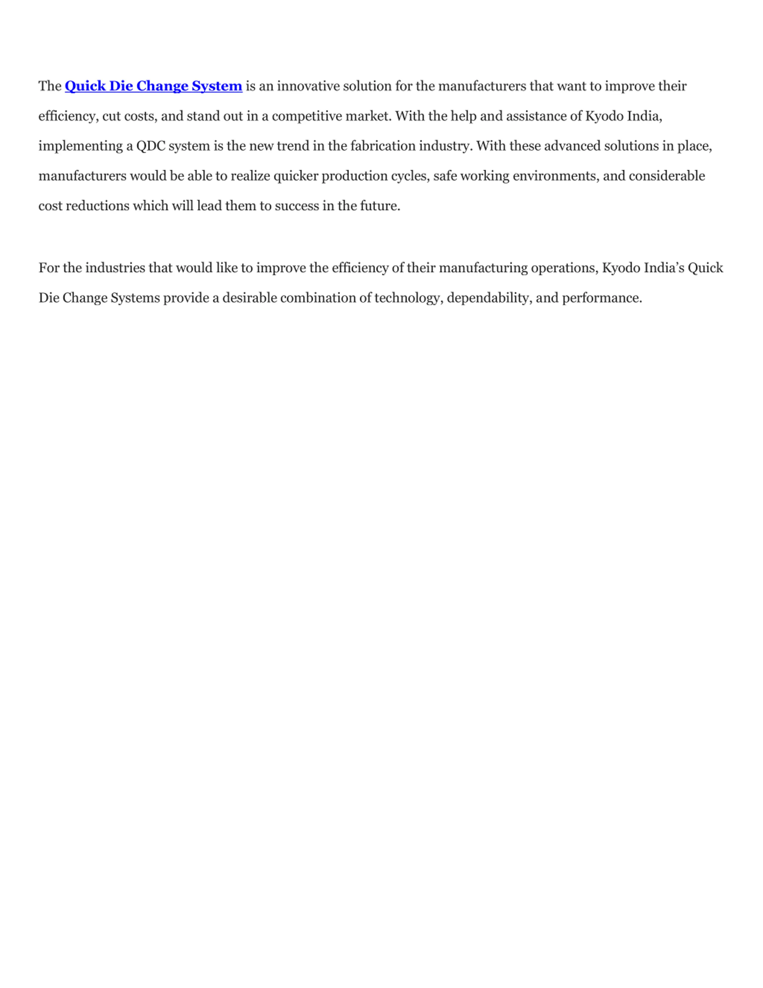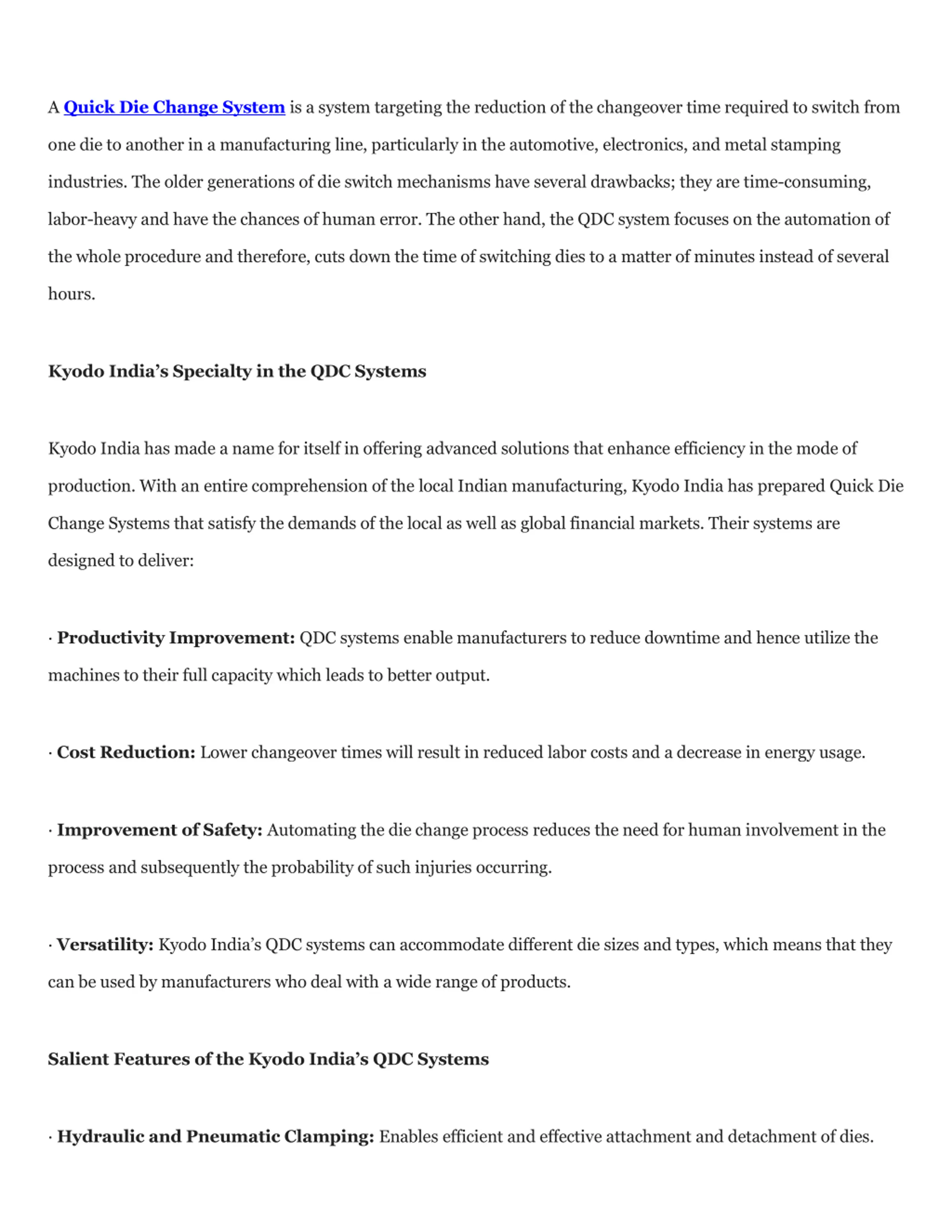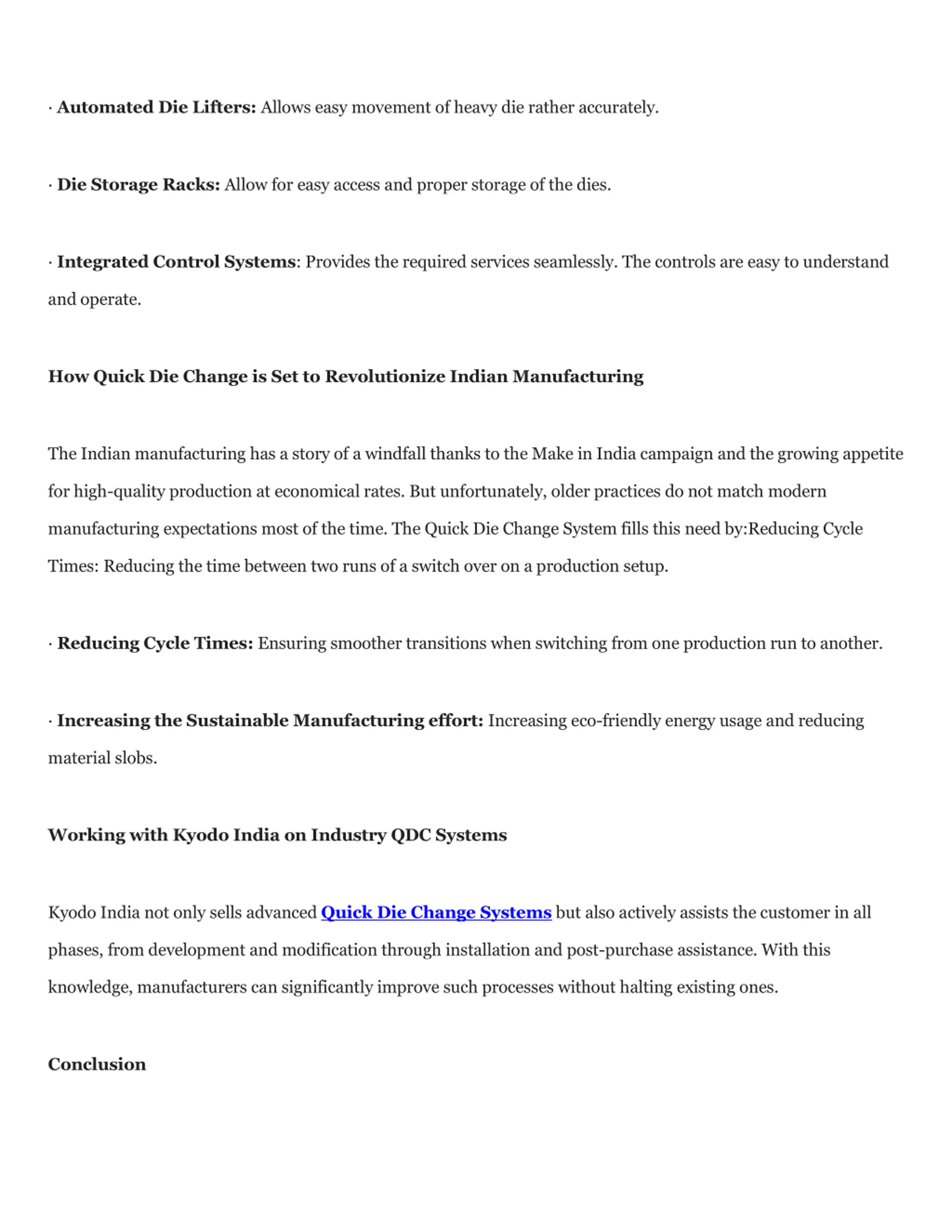 Automated Die Lifters: Allows easy movement of heavy die rather accurately. Die Storage Racks: Allow for easy access and proper storage of the dies. Integrated Control Systems: Provides the required services seamlessly. The controls are easy to understand and operate. How Quick Die Change is Set to Revolutionize Indian Manufacturing The Indian manufacturing has a story of a windfall thanks to the Make in India campaign and the growing appetite for high-quality production at economical rates. But unfortunately, older practices do not match modern manufacturing expectations most of the time. The Quick Die Change System fills this need by:Reducing Cycle Times: Reducing the time between two runs of a switch over on a production setup. Reducing Cycle Times: Ensuring smoother transitions when switching from one production run to another. Increasing the Sustainable Manufacturing effort: Increasing eco-friendly energy usage and reducing material slobs. Working with Kyodo India on Industry QDC Systems Kyodo India not only sells advanced Quick Die Change Systems but also actively assists the customer in all phases, from development and modification through installation and post-purchase assistance. With this knowledge, manufacturers can significantly improve such processes without halting existing ones. Conclusion