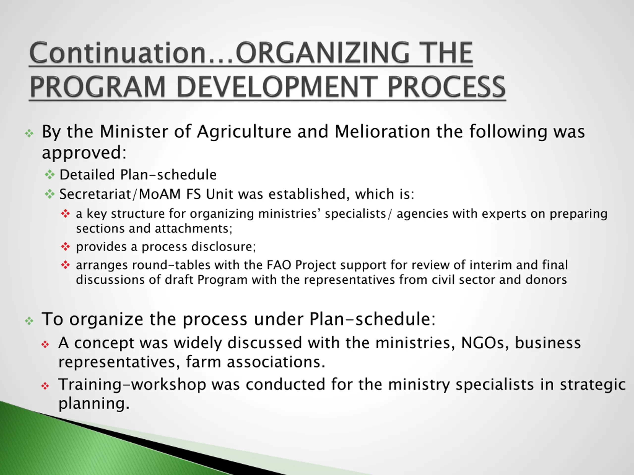 By the Minister of Agriculture and Melioration the following was approved: Detailed Plan-schedule Secretariat/MoAM FS Unit was established, which is: a key structure for organizing ministries specialists/ agencies with experts on preparing sections and attachments; provides a process disclosure; arranges round-tables with the FAO Project support for review of interim and final discussions of draft Program with the representatives from civil sector and donors To organize the process under Plan-schedule: A concept was widely discussed with the ministries, NGOs, business representatives, farm associations. Training-workshop was conducted for the ministry specialists in strategic planning.