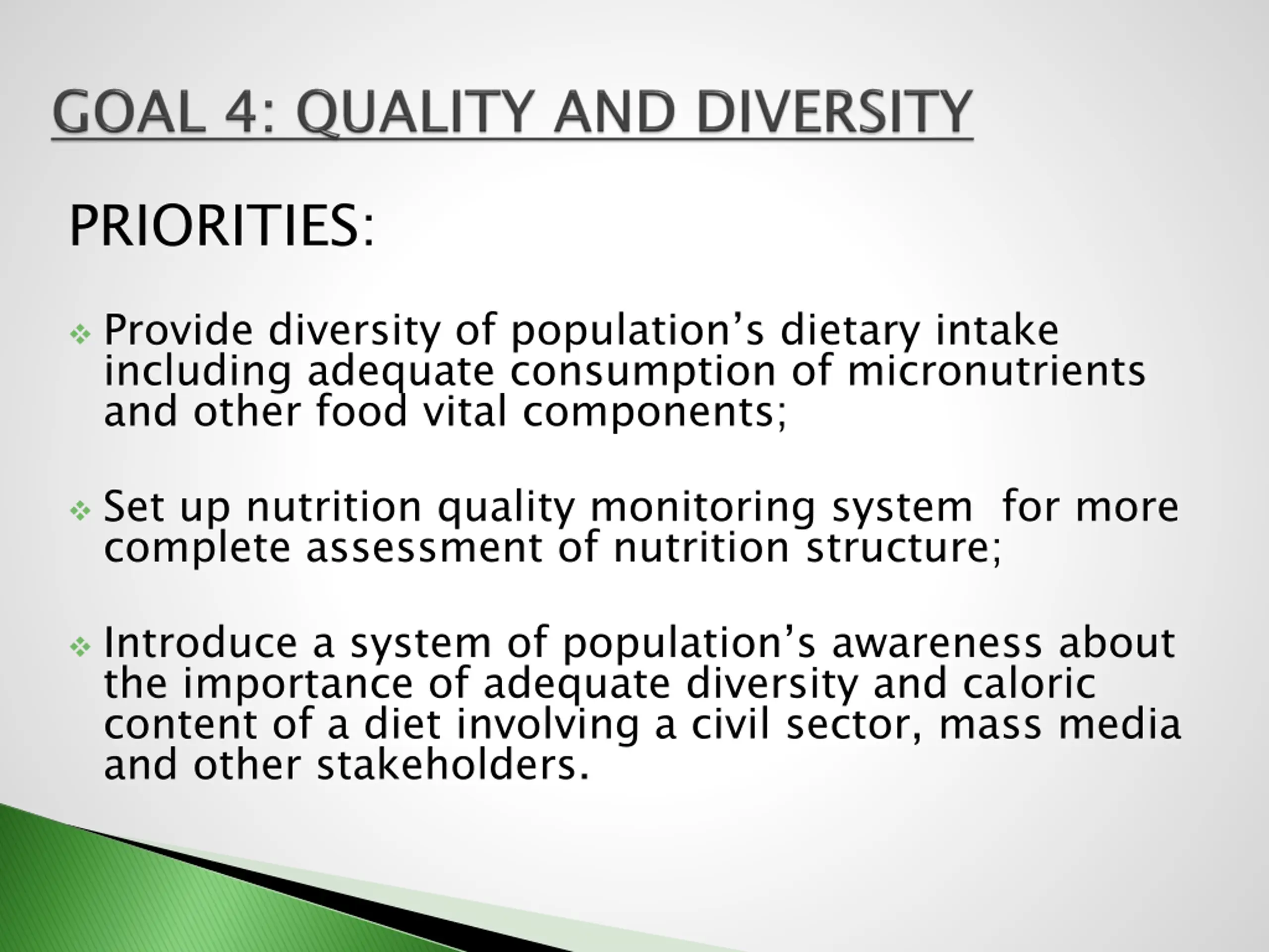 PRIORITIES: Provide diversity of population s dietary intake including adequate consumption of micronutrients and other food vital components; Set up nutrition quality monitoring system for more complete assessment of nutrition structure; Introduce a system of population s awareness about the importance of adequate diversity and caloric content of a diet involving a civil sector, mass media and other stakeholders.