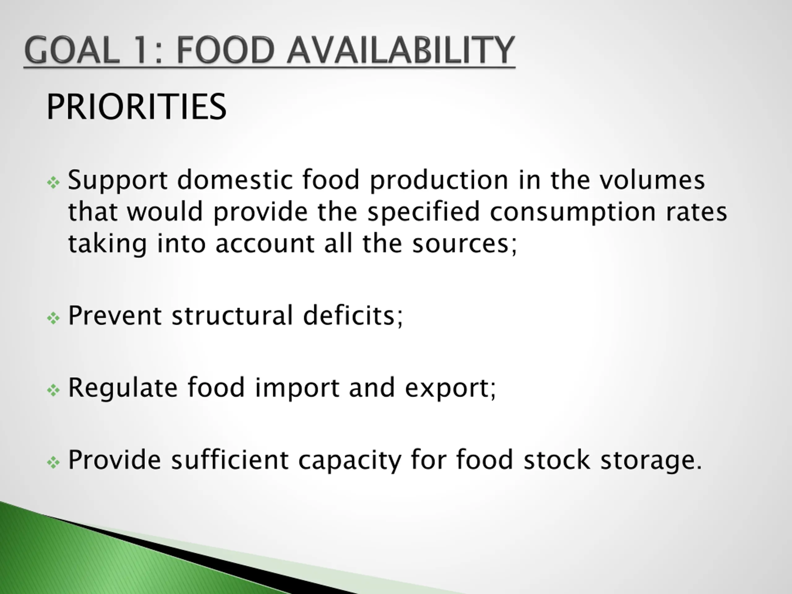 PRIORITIES Support domestic food production in the volumes that would provide the specified consumption rates taking into account all the sources; Prevent structural deficits; Regulate food import and export; Provide sufficient capacity for food stock storage.