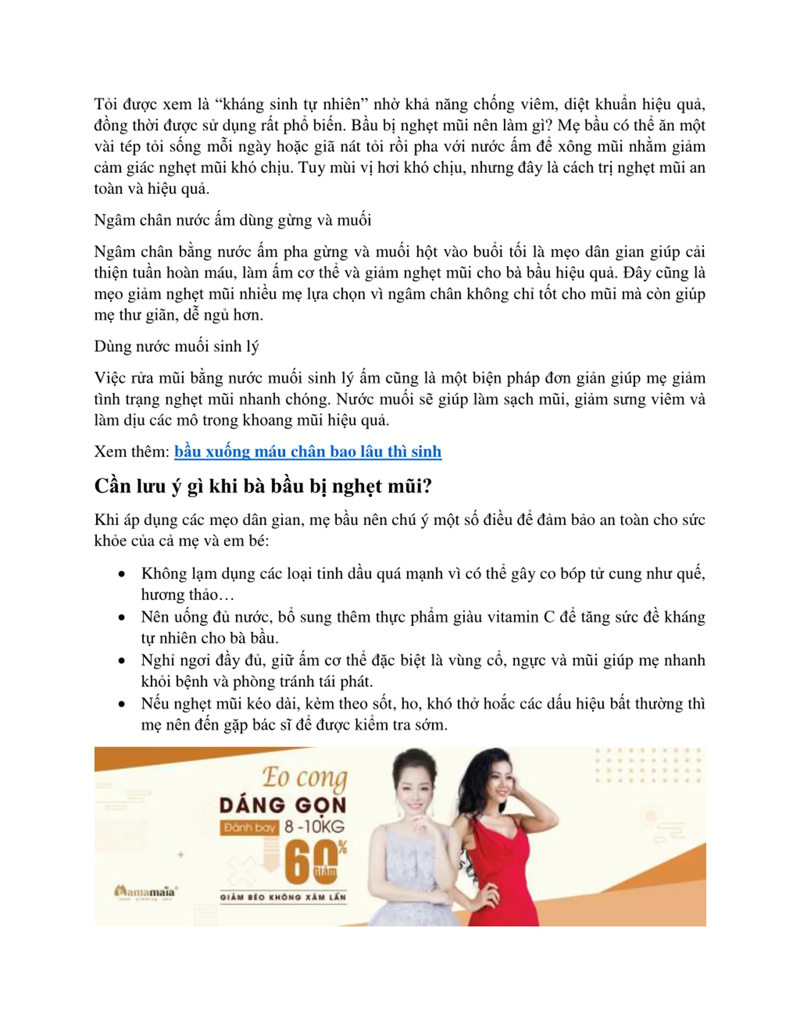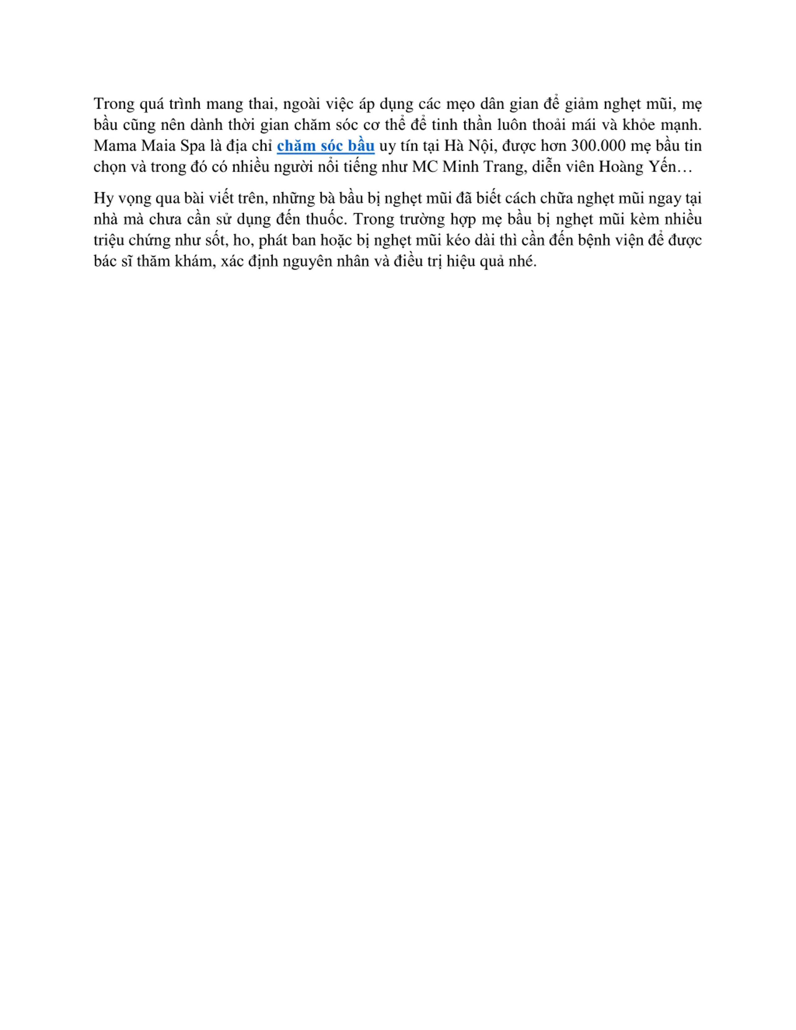 Trong qu trnh mang thai, ngoi vic p dng cc mo dn gian gim nght mi, m b u c ng n n d nh th i gian ch m s c c th tinh th n lu n tho i m i v kh e m nh. Mama Maia Spa l a ch ch m s c b u uy t n t i H N i, c h n 300.000 m b u tin ch n v trong c nhi u ng i n i ti ng nh MC Minh Trang, di n vi n Ho ng Y n Hy v ng qua b i vi t tr n, nh ng b b u b ngh t m i bi t c ch ch a ngh t m i ngay t i nh m ch a c n s d ng n thu c. Trong tr ng h p m b u b ngh t m i k m nhi u tri u ch ng nh s t, ho, ph t ban ho c b ngh t m i k o d i th c n n b nh vi n c b c s th m kh m, x c nh nguy n nh n v i u tr hi u qu nh .