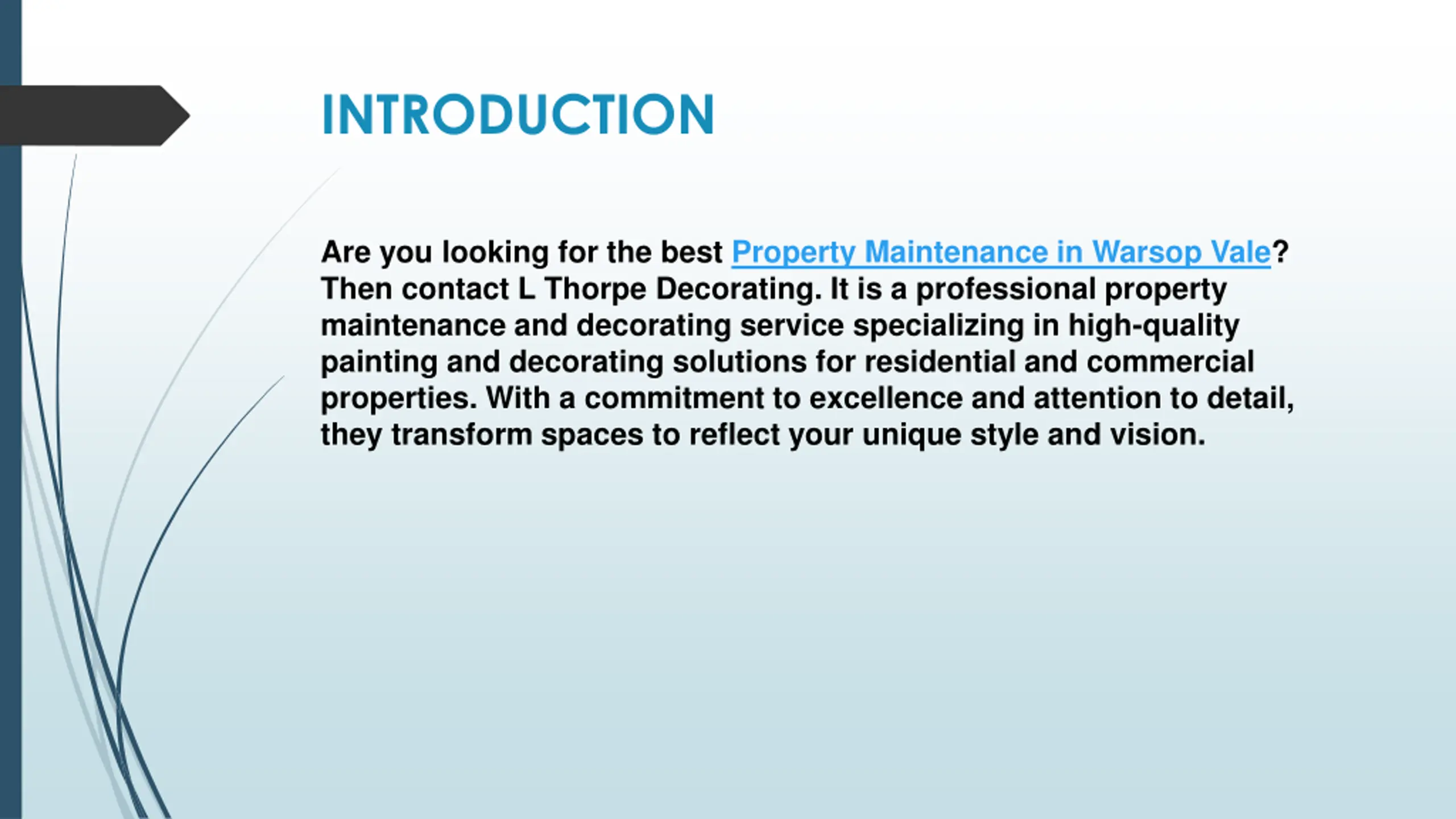 INTRODUCTION Are you looking for the best Property Maintenance in Warsop Vale? Then contact L Thorpe Decorating. It is a professional property maintenance and decorating service specializing in high-quality painting and decorating solutions for residential and commercial properties. With a commitment to excellence and attention to detail, they transform spaces to reflect your unique style and vision.