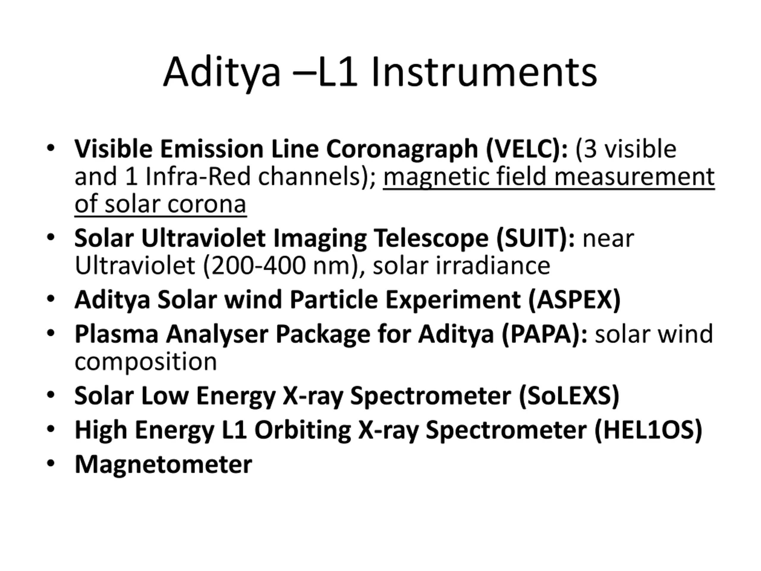 Aditya L1 Instruments Visible Emission Line Coronagraph (VELC): (3 visible and 1 Infra-Red channels); magnetic field measurement of solar corona Solar Ultraviolet Imaging Telescope (SUIT): near Ultraviolet (200-400 nm), solar irradiance Aditya Solar wind Particle Experiment (ASPEX) Plasma Analyser Package for Aditya (PAPA): solar wind composition Solar Low Energy X-ray Spectrometer (SoLEXS) High Energy L1 Orbiting X-ray Spectrometer (HEL1OS) Magnetometer