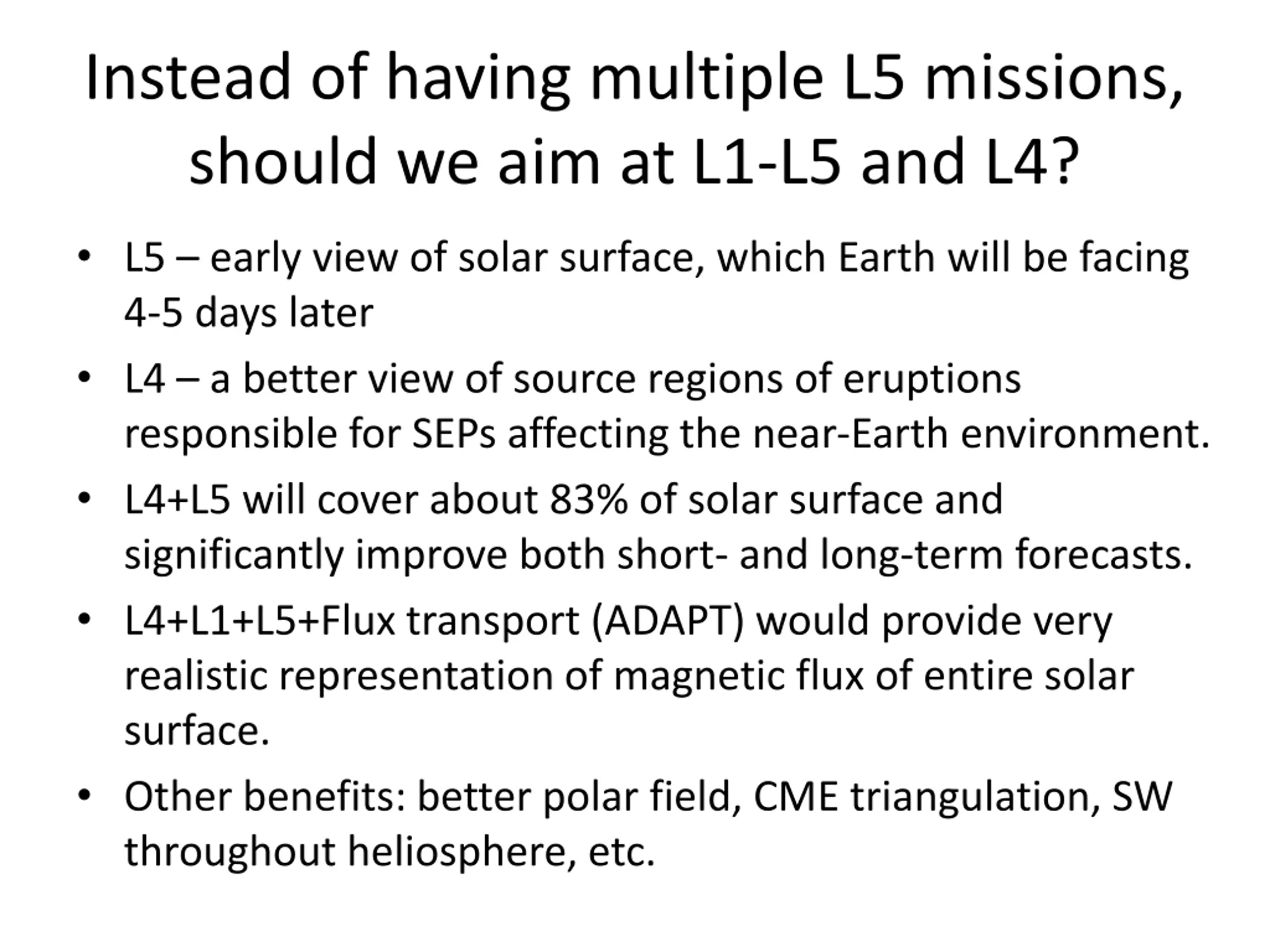 Instead of having multiple L5 missions, should we aim at L1-L5 and L4? L5 early view of solar surface, which Earth will be facing 4-5 days later L4 a better view of source regions of eruptions responsible for SEPs affecting the near-Earth environment. L4+L5 will cover about 83% of solar surface and significantly improve both short- and long-term forecasts. L4+L1+L5+Flux transport (ADAPT) would provide very realistic representation of magnetic flux of entire solar surface. Other benefits: better polar field, CME triangulation, SW throughout heliosphere, etc.