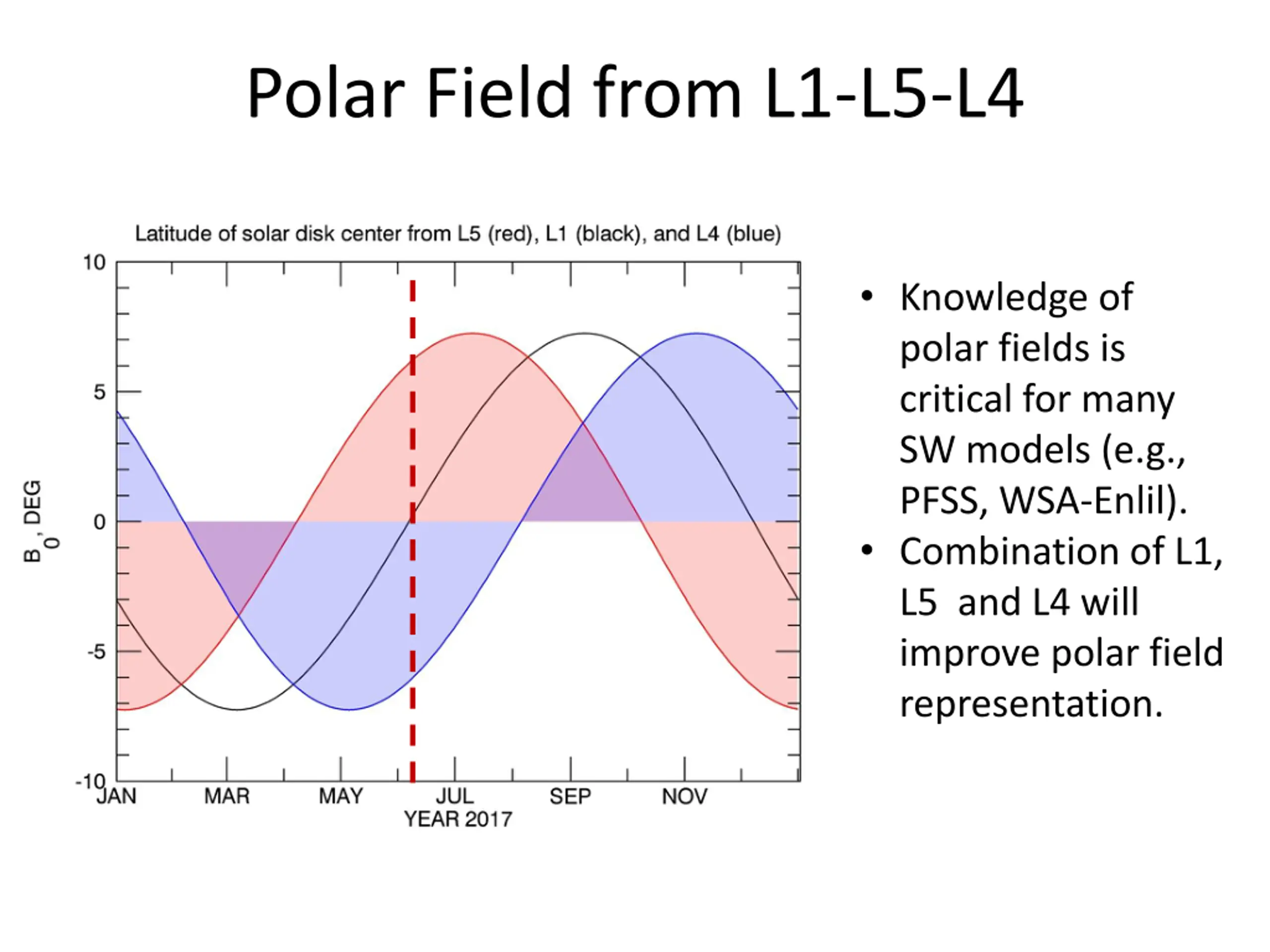 Polar Field from L1-L5-L4 Knowledge of polar fields is critical for many SW models (e.g., PFSS, WSA-Enlil). Combination of L1, L5 and L4 will improve polar field representation.