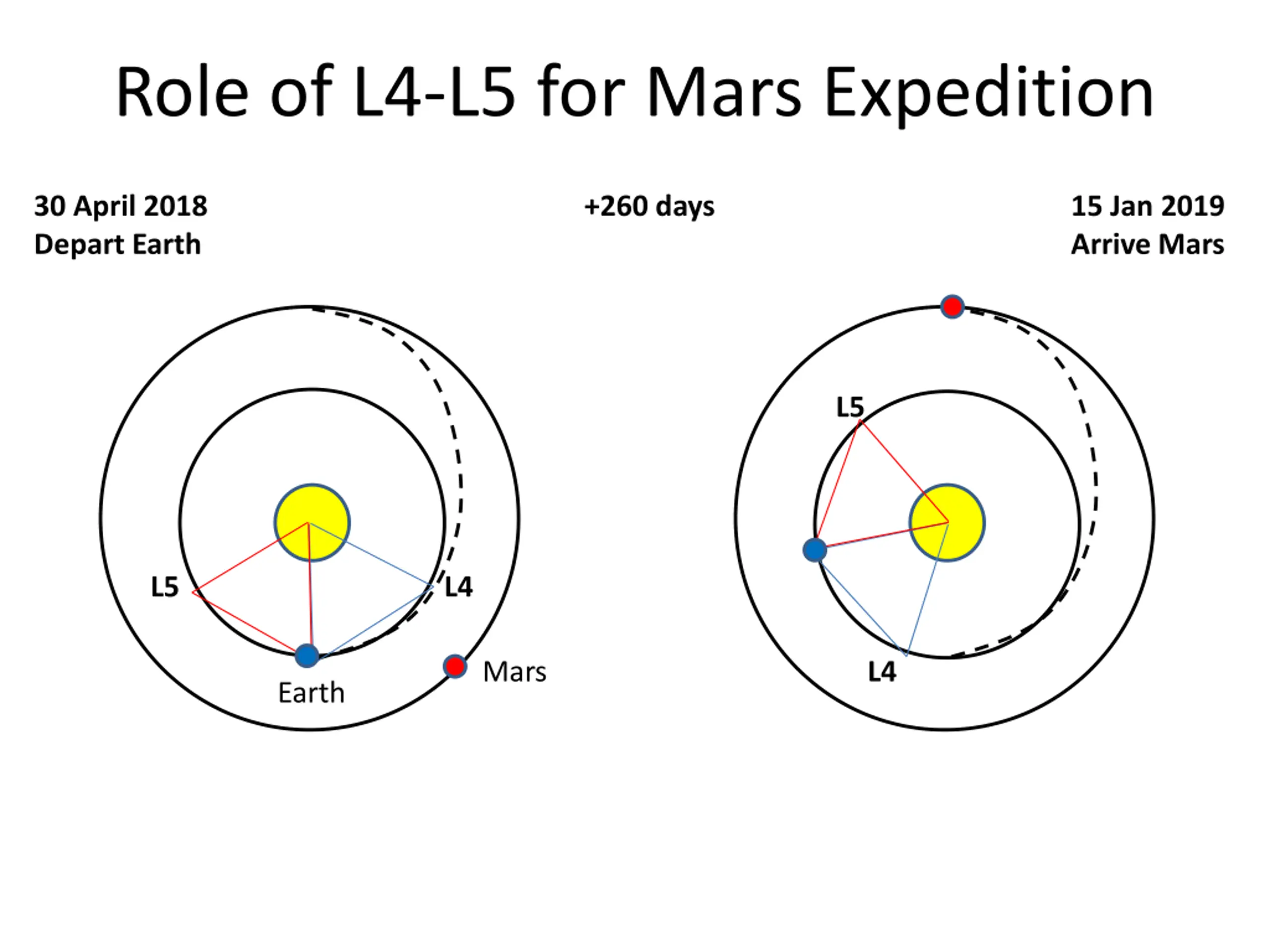 Role of L4-L5 for Mars Expedition 30 April 2018 Depart Earth +260 days 15 Jan 2019 Arrive Mars L5 L5 L4 Mars L4 Earth