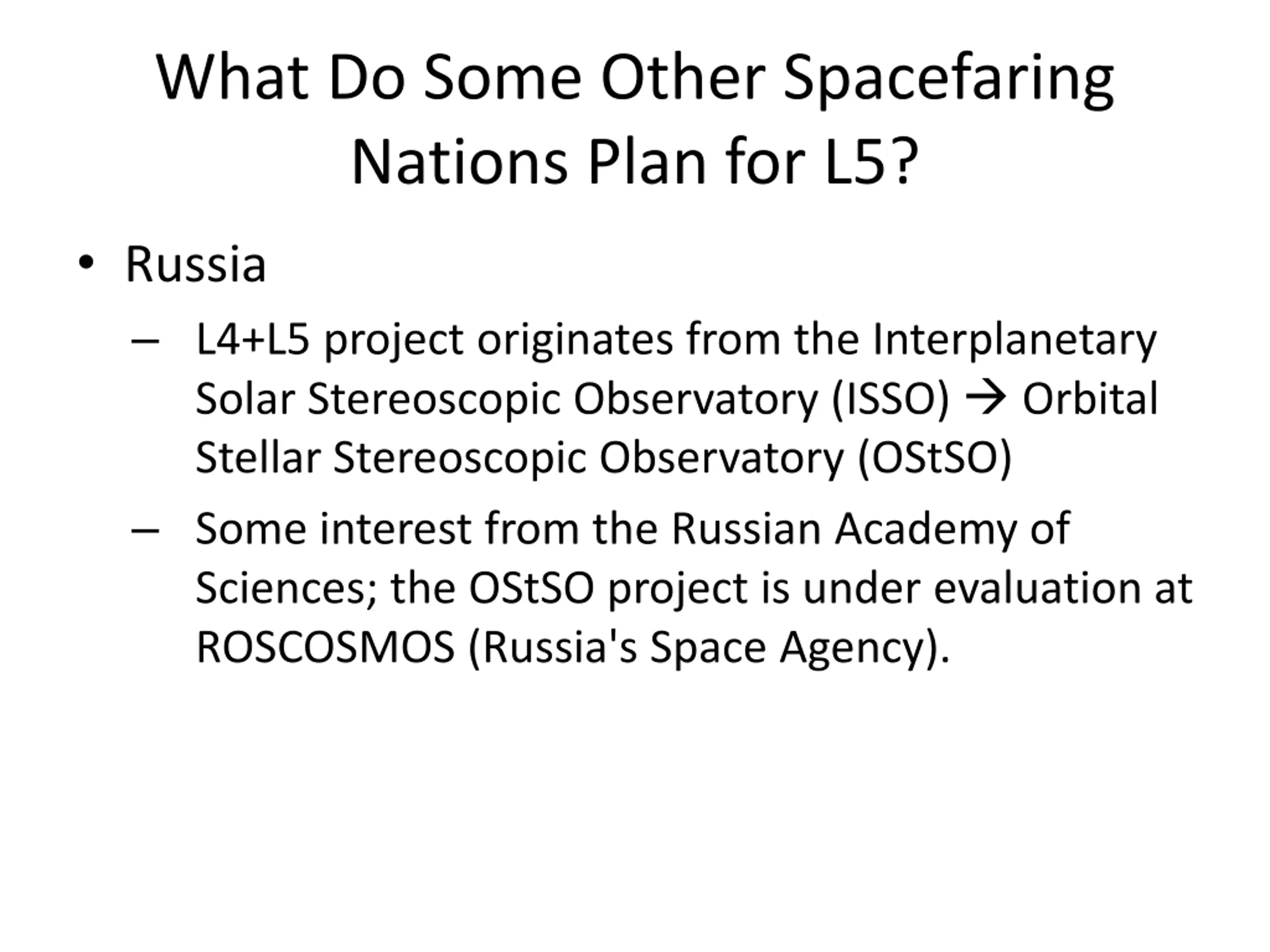 What Do Some Other Spacefaring Nations Plan for L5? Russia L4+L5 project originates from the Interplanetary Solar Stereoscopic Observatory (ISSO) Orbital Stellar Stereoscopic Observatory (OStSO) Some interest from the Russian Academy of Sciences; the OStSO project is under evaluation at ROSCOSMOS (Russia's Space Agency).