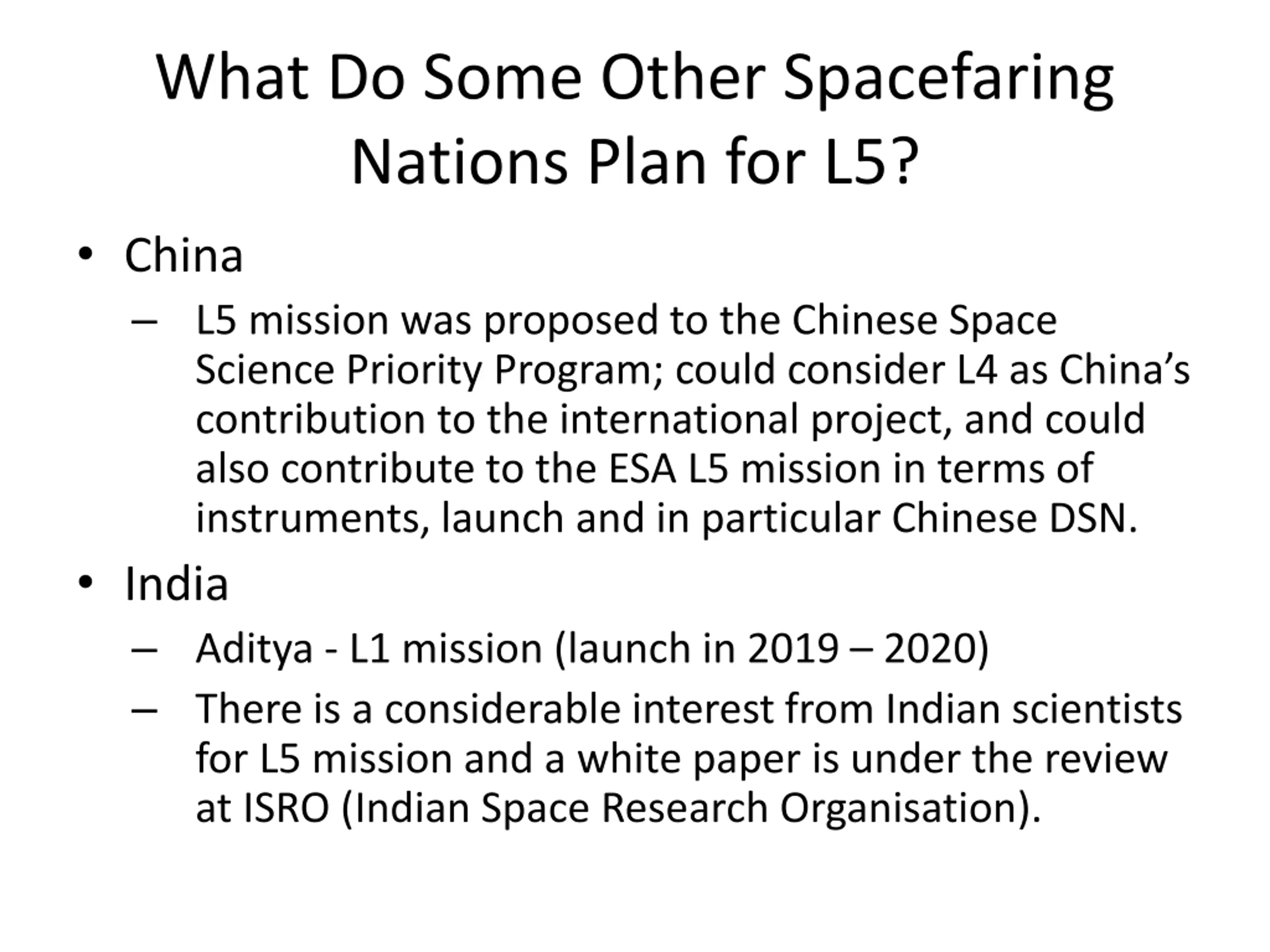 What Do Some Other Spacefaring Nations Plan for L5? China L5 mission was proposed to the Chinese Space Science Priority Program; could consider L4 as China s contribution to the international project, and could also contribute to the ESA L5 mission in terms of instruments, launch and in particular Chinese DSN. India Aditya - L1 mission (launch in 2019 2020) There is a considerable interest from Indian scientists for L5 mission and a white paper is under the review at ISRO (Indian Space Research Organisation).