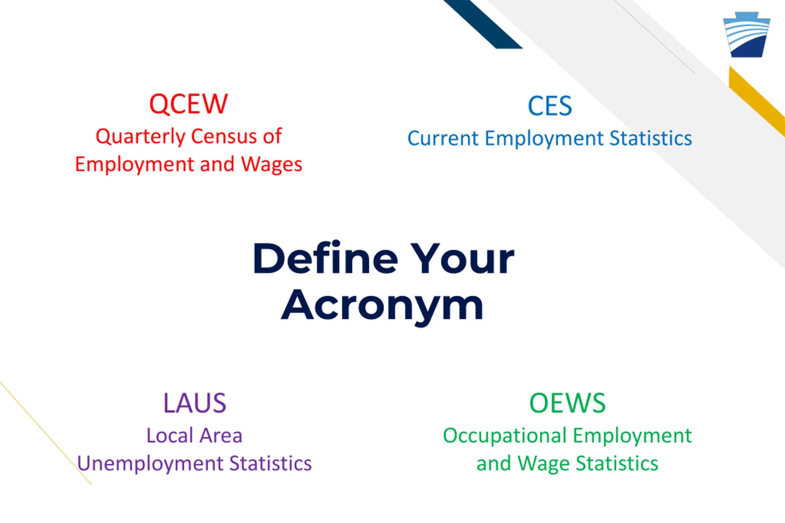 QCEW CES Quarterly Census of Employment and Wages Current Employment Statistics Define Your Acronym LAUS Local Area OEWS Occupational Employment and Wage Statistics Unemployment Statistics