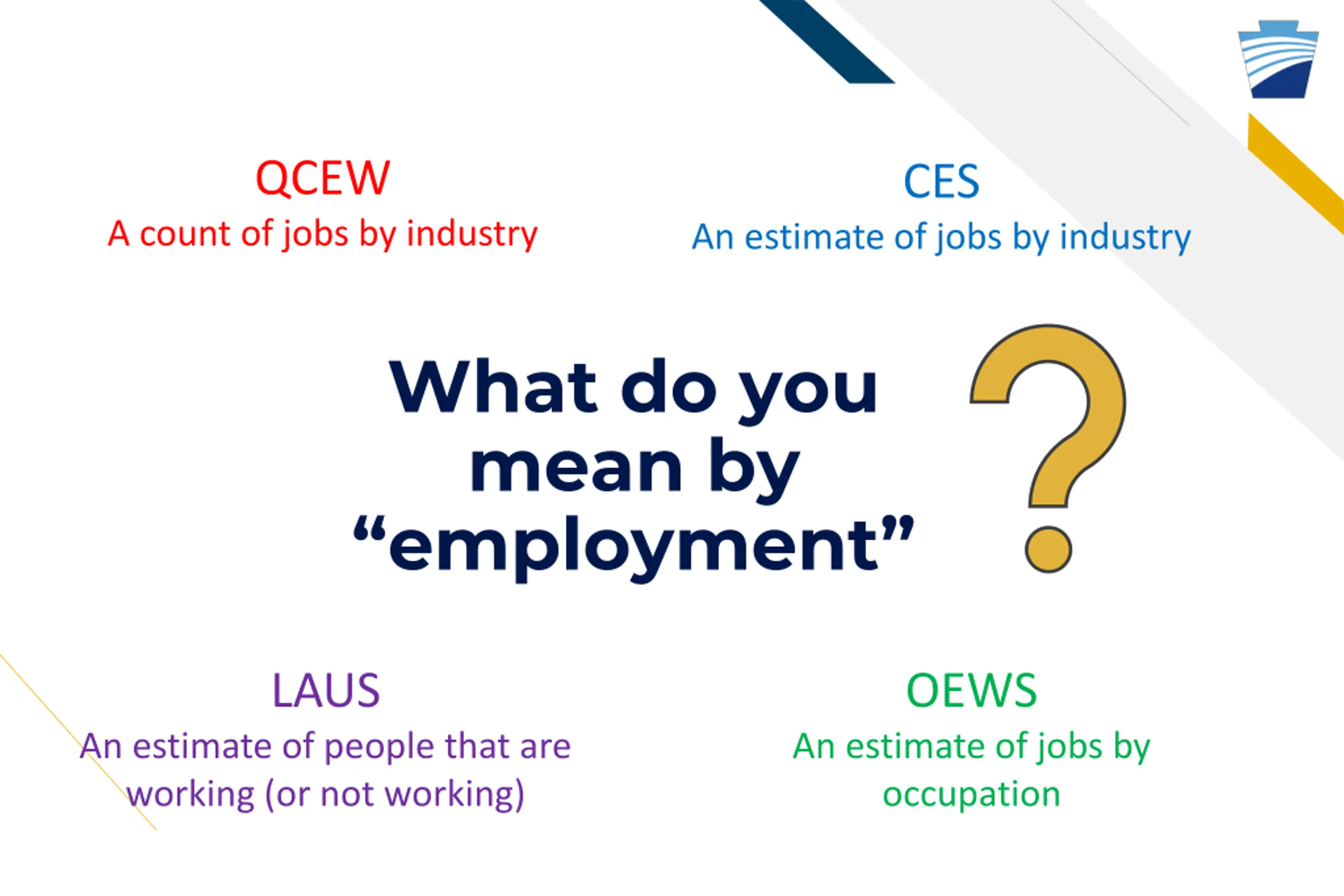 QCEW CES A count of jobs by industry An estimate of jobs by industry What do you mean by employment LAUS OEWS An estimate of people that are working (or not working) An estimate of jobs by occupation