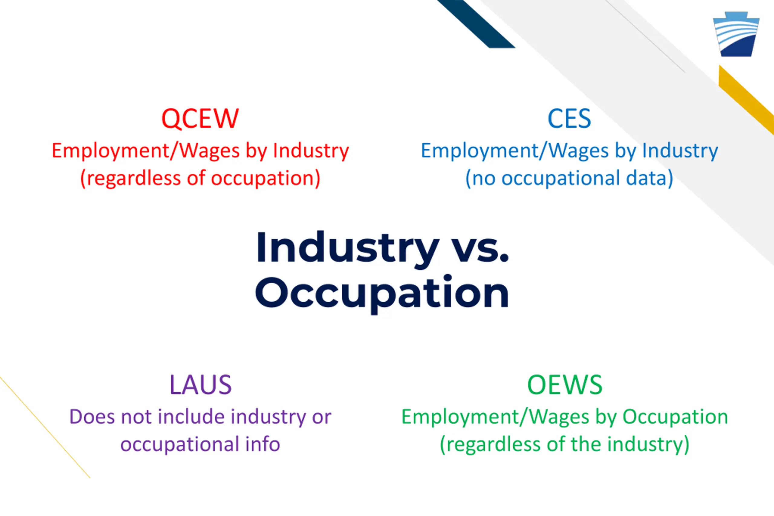 QCEW CES Employment/Wages by Industry (regardless of occupation) Employment/Wages by Industry (no occupational data) Industry vs. Occupation LAUS OEWS Does not include industry or occupational info Employment/Wages by Occupation (regardless of the industry)