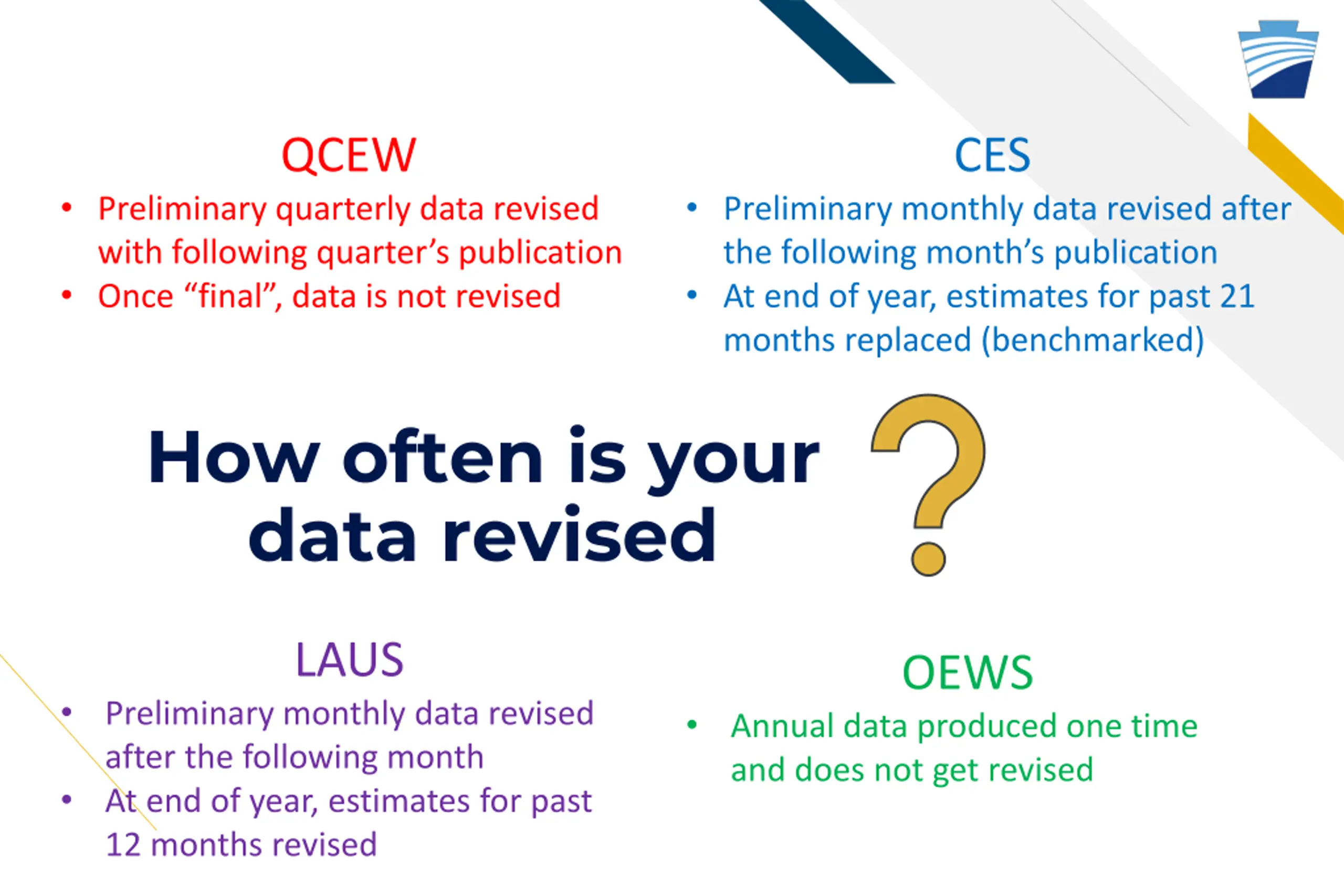 QCEW CES Preliminary quarterly data revised with following quarter s publication Once final , data is not revised Preliminary monthly data revised after the following month s publication At end of year, estimates for past 21 months replaced (benchmarked) How often is your data revised LAUS OEWS Preliminary monthly data revised after the following month At end of year, estimates for past 12 months revised Annual data produced one time and does not get revised