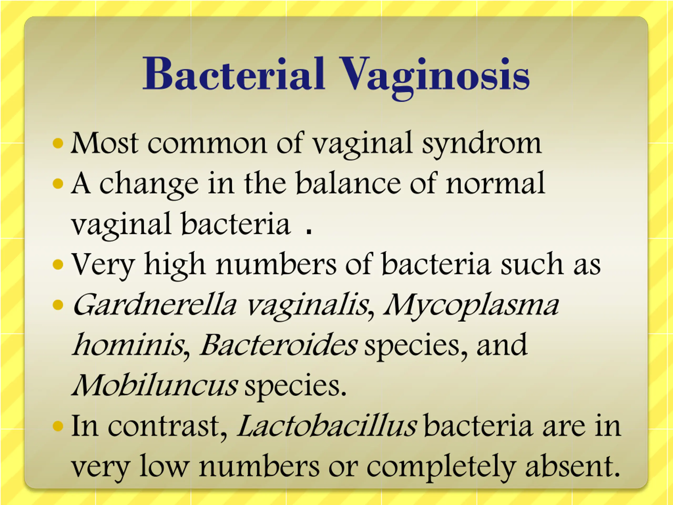 Bacterial Vaginosis Most common of vaginal syndrom A change in the balance of normal vaginal bacteria . Very high numbers of bacteria such as Gardnerella vaginalis, Mycoplasma hominis, Bacteroides species, and Mobiluncus species. In contrast, Lactobacillus bacteria are in very low numbers or completely absent.