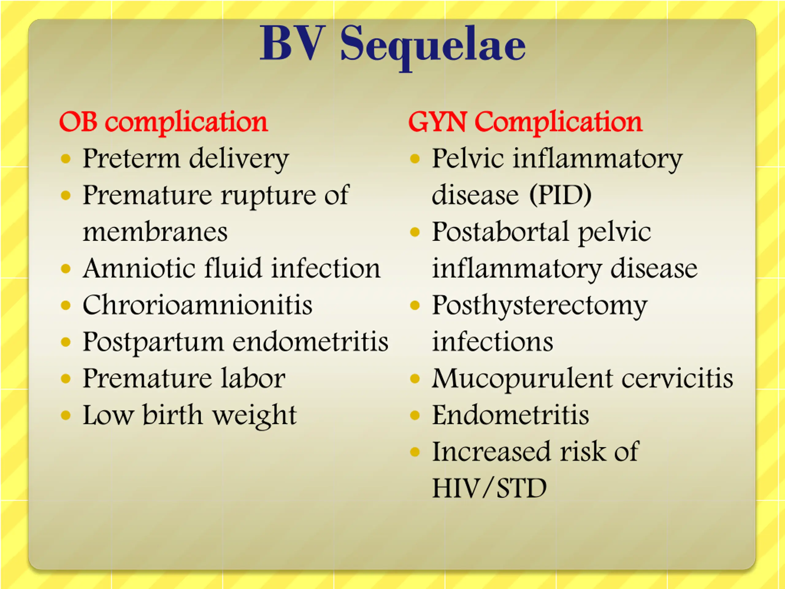 BV Sequelae OB complication OB complication Preterm delivery Premature rupture of membranes Amniotic fluid infection Chrorioamnionitis Postpartum endometritis Premature labor Low birth weight GYN Complication GYN Complication Pelvic inflammatory disease (PID) Postabortal pelvic inflammatory disease Posthysterectomy infections Mucopurulent cervicitis Endometritis Increased risk of HIV/STD