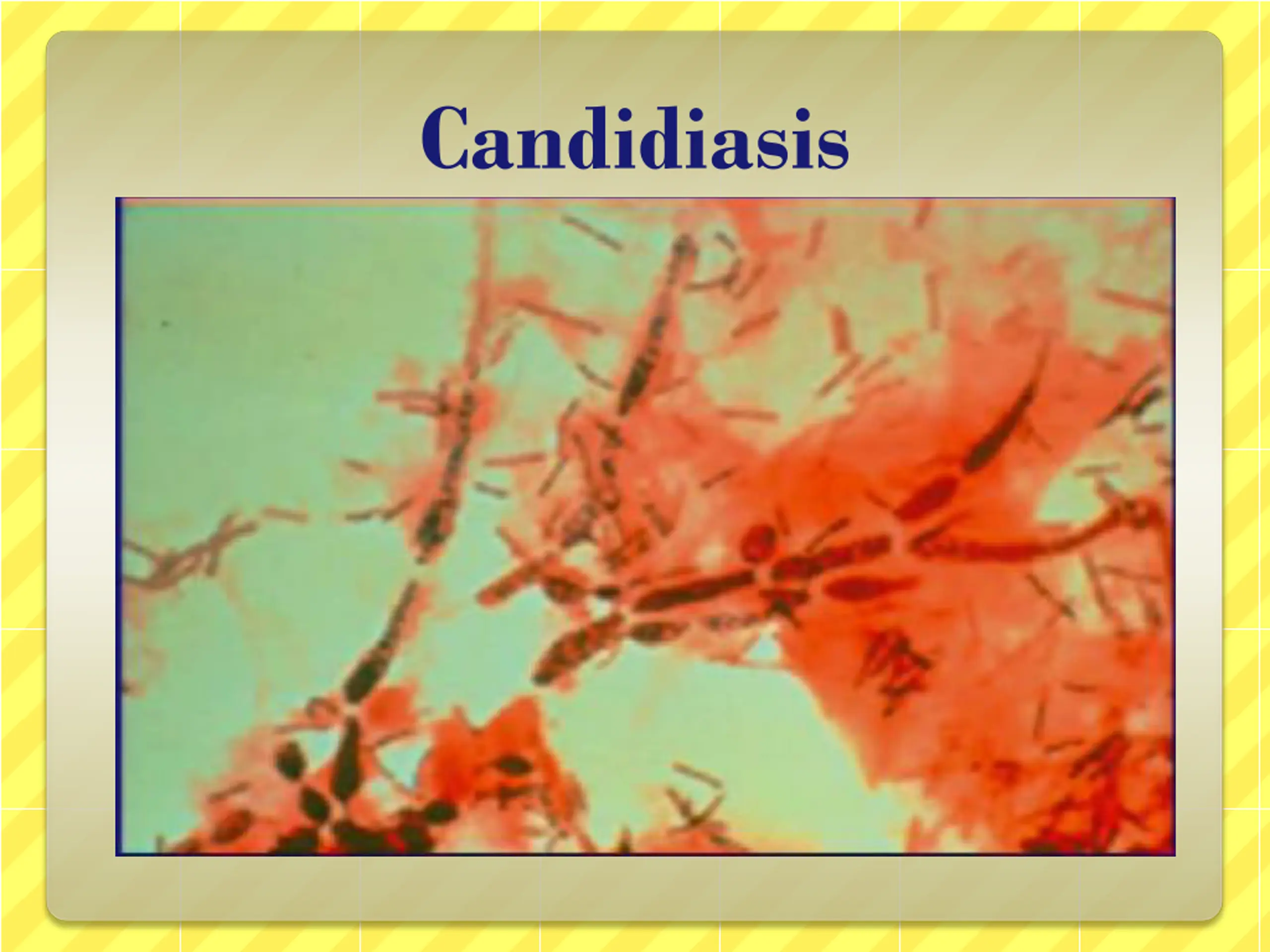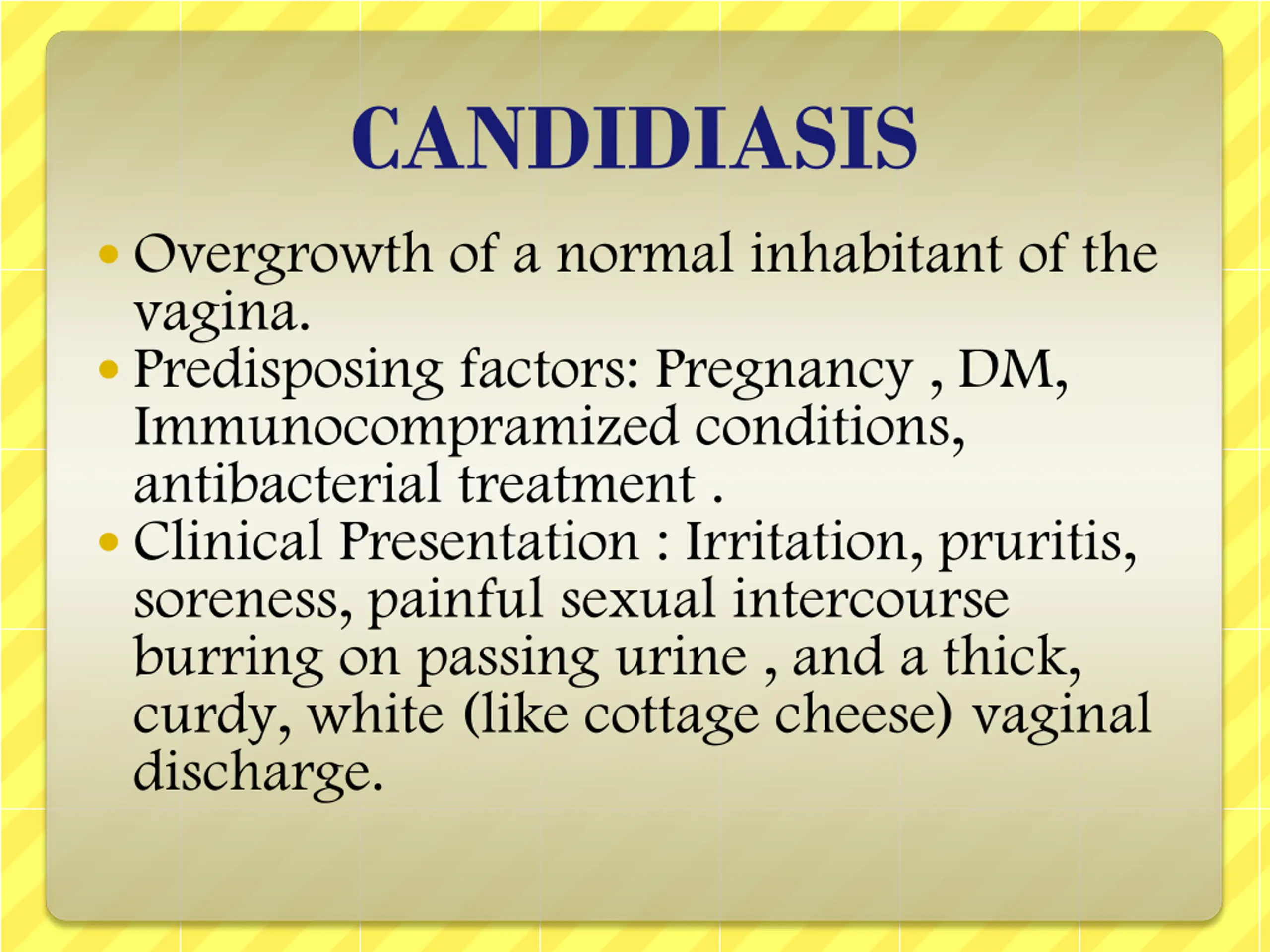 CANDIDIASIS Overgrowth of a normal inhabitant of the vagina. Predisposing factors: Pregnancy , DM, Immunocompramized conditions, antibacterial treatment . Clinical Presentation : Irritation, pruritis, soreness, painful sexual intercourse burring on passing urine , and a thick, curdy, white (like cottage cheese) vaginal discharge.