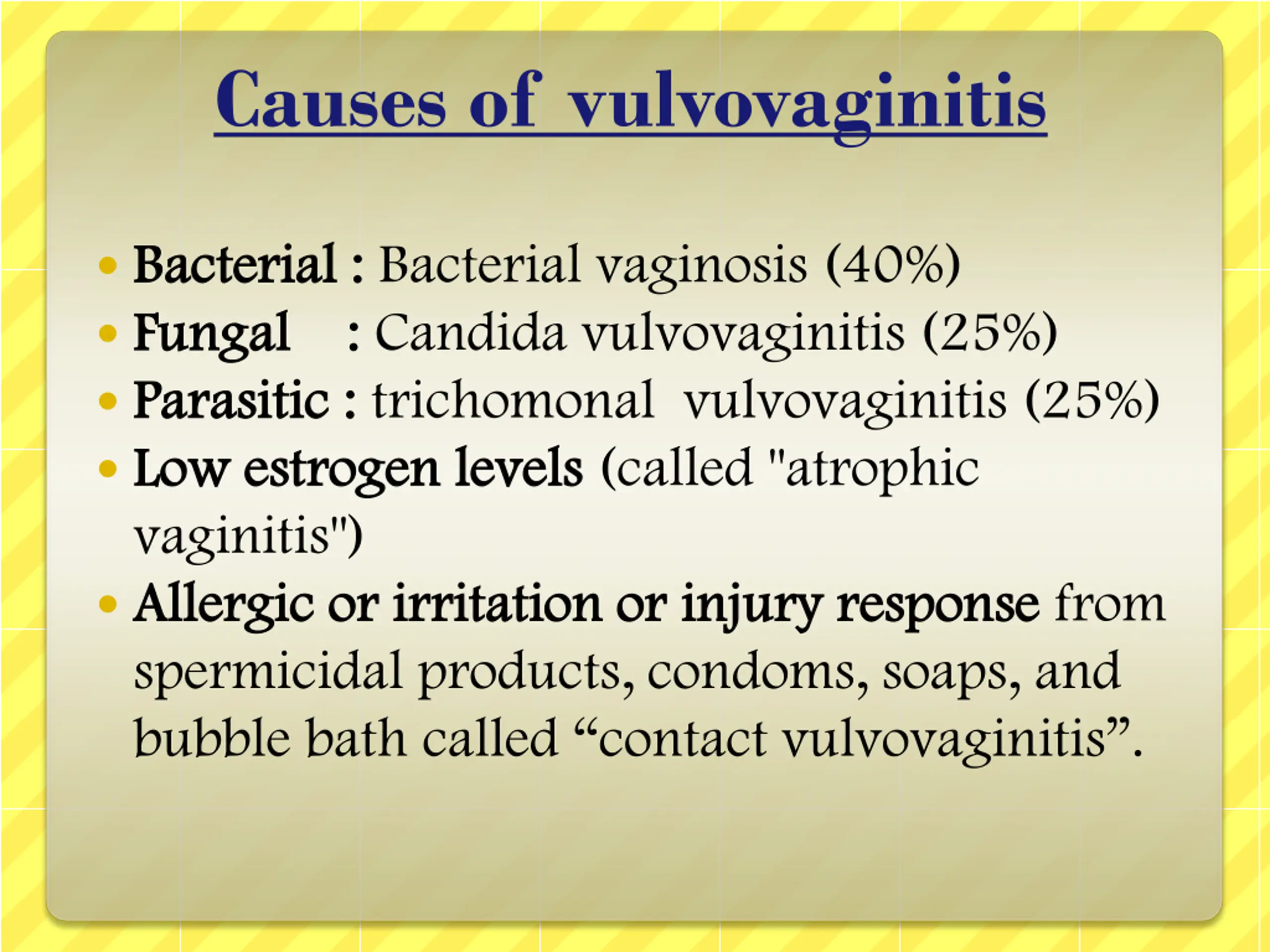 Causes of vulvovaginitis Bacterial : Bacterial : Bacterial vaginosis (40%) Fungal : Fungal : Candida vulvovaginitis (25%) Parasitic : Parasitic : trichomonal vulvovaginitis (25%) Low estrogen levels Low estrogen levels (called "atrophic vaginitis") Allergic or irritation or injury response Allergic or irritation or injury response from spermicidal products, condoms, soaps, and bubble bath called contact vulvovaginitis .