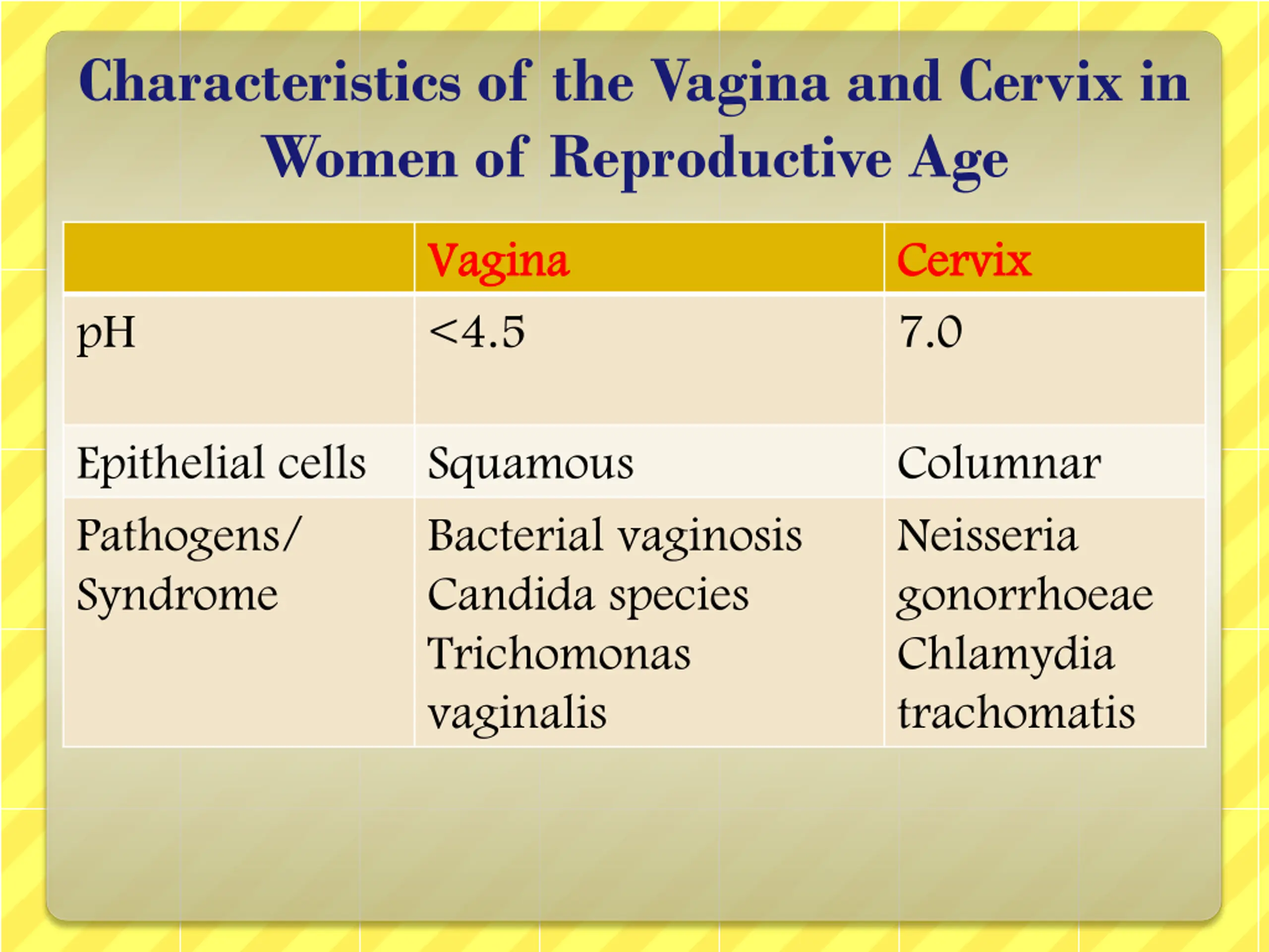 Characteristics of the Vagina and Cervix in Women of Reproductive Age Vagina Vagina Cervix Cervix pH <4.5 7.0 Epithelial cells Squamous Columnar Pathogens/ Syndrome Bacterial vaginosis Candida species Trichomonas vaginalis Neisseria gonorrhoeae Chlamydia trachomatis