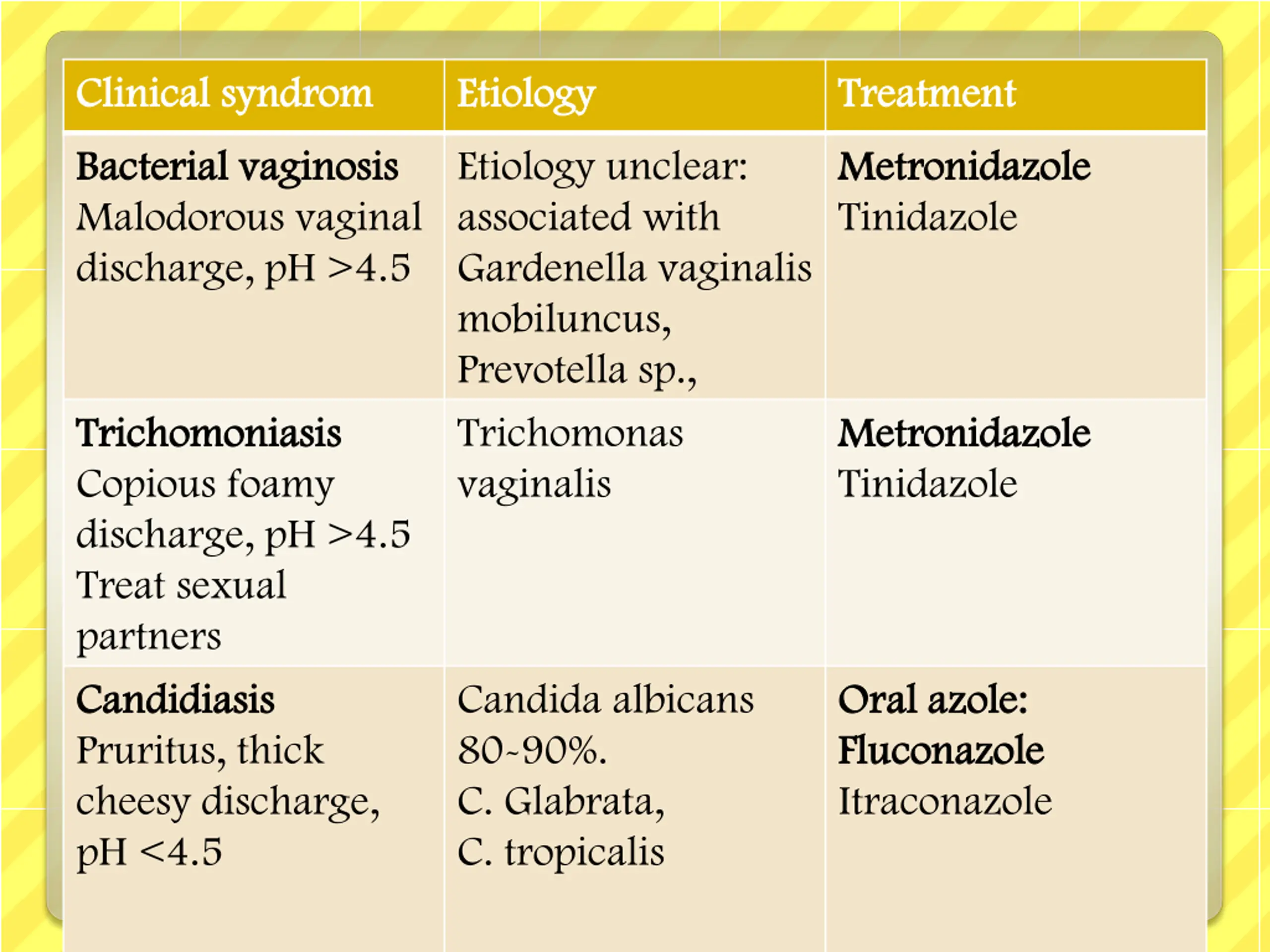 Clinical Clinical syndrom syndrom Etiology Etiology Treatment Treatment Bacterial Bacterial vaginosis Malodorous vaginal discharge, pH >4.5 vaginosis Etiology unclear: associated with Gardenella vaginalis mobiluncus, Prevotella sp., Metronidazole Metronidazole Tinidazole Trichomoniasis Trichomoniasis Copious foamy discharge, pH >4.5 Treat sexual partners Trichomonas vaginalis Metronidazole Metronidazole Tinidazole Candidiasis Candidiasis Pruritus, thick cheesy discharge, pH <4.5 Candida albicans 80-90%. C. Glabrata, C. tropicalis Oral Oral azole azole: : Fluconazole Fluconazole Itraconazole