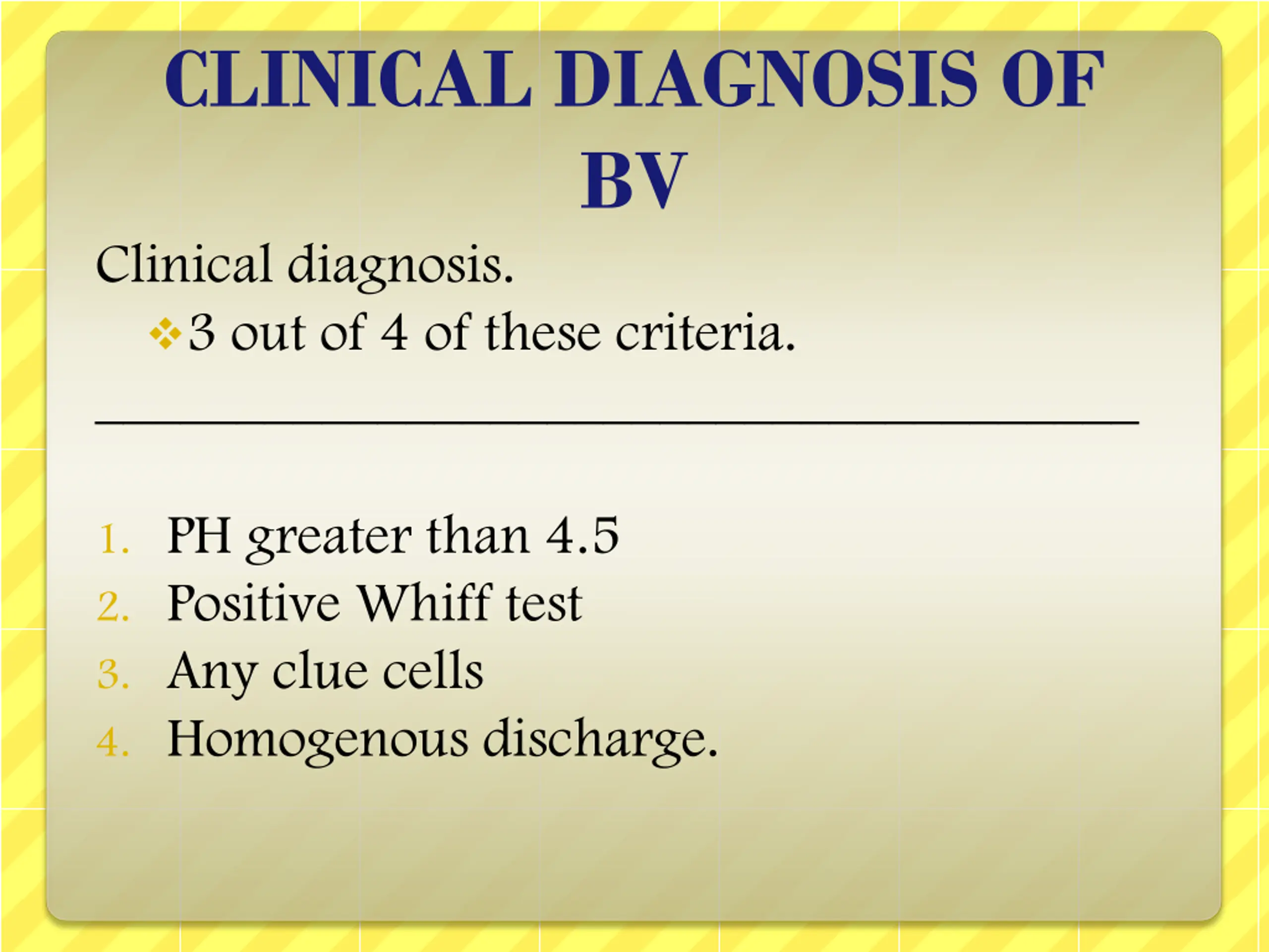 CLINICAL DIAGNOSIS OF BV Clinical diagnosis. 3 out of 4 of these criteria. _____________________________________ 1. PH greater than 4.5 2. Positive Whiff test 3. Any clue cells 4. Homogenous discharge.