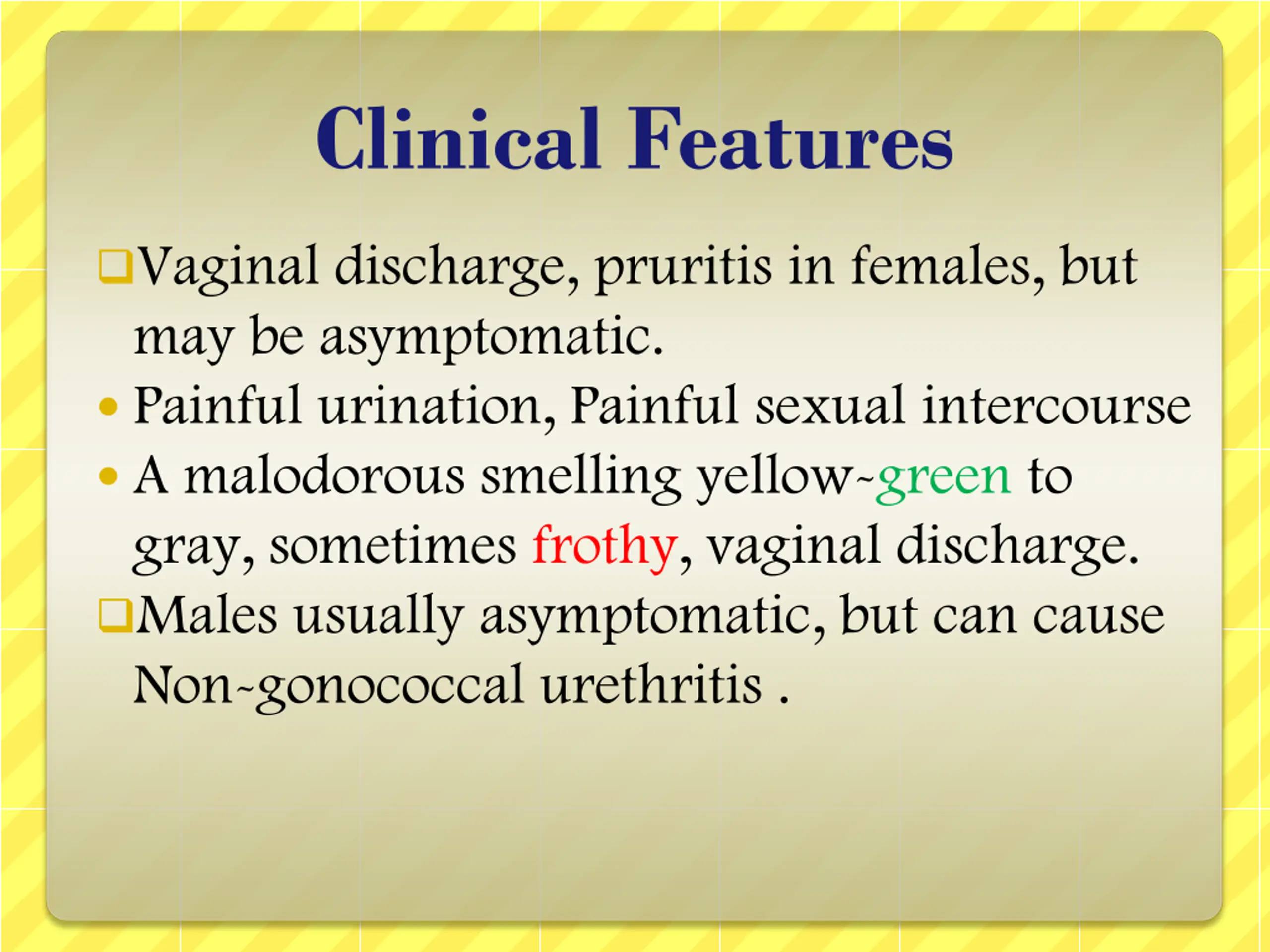Clinical Features Vaginal discharge, pruritis in females, but may be asymptomatic. Painful urination, Painful sexual intercourse A malodorous smelling yellow-green to gray, sometimes frothy, vaginal discharge. Males usually asymptomatic, but can cause Non-gonococcal urethritis .