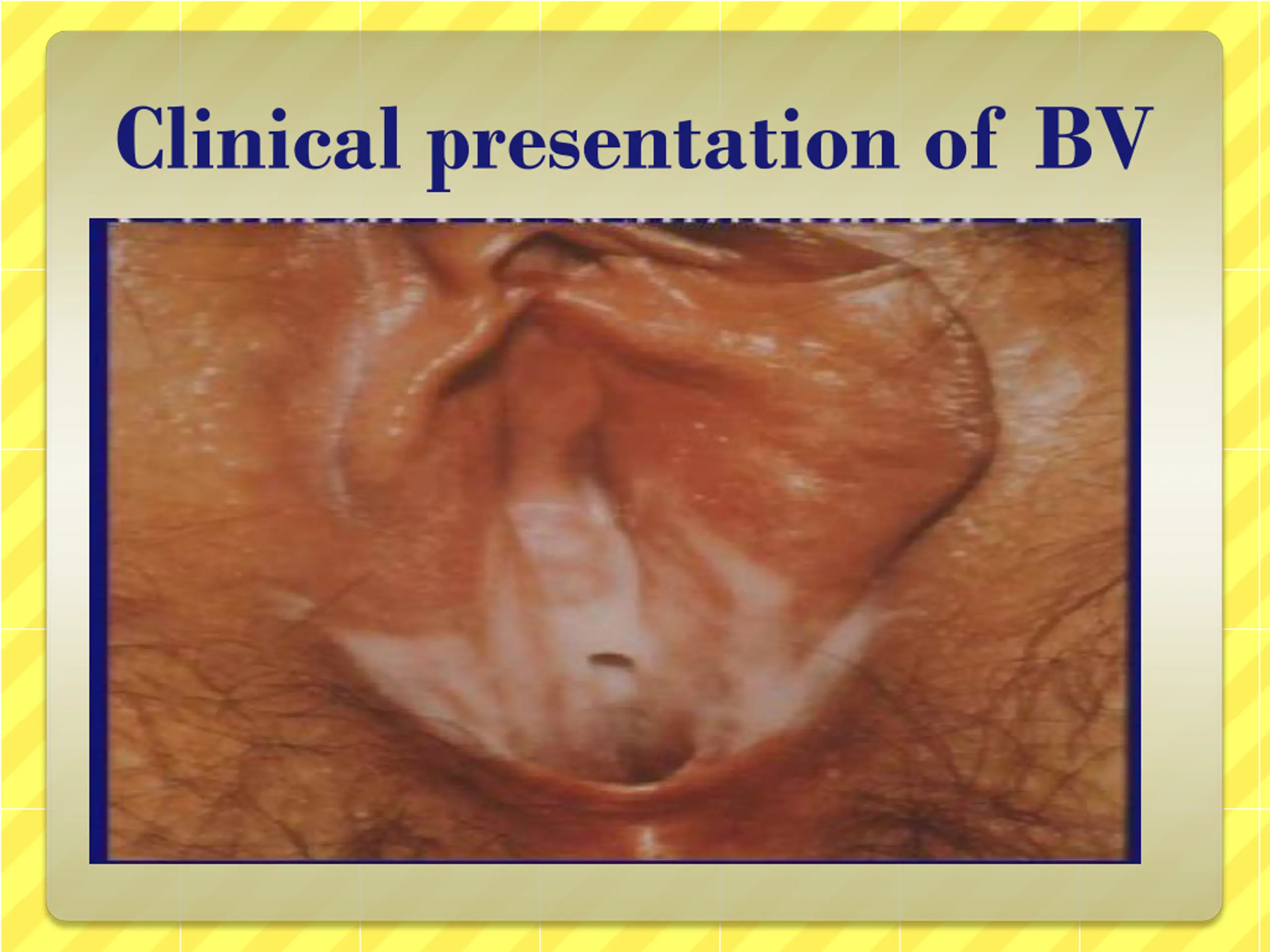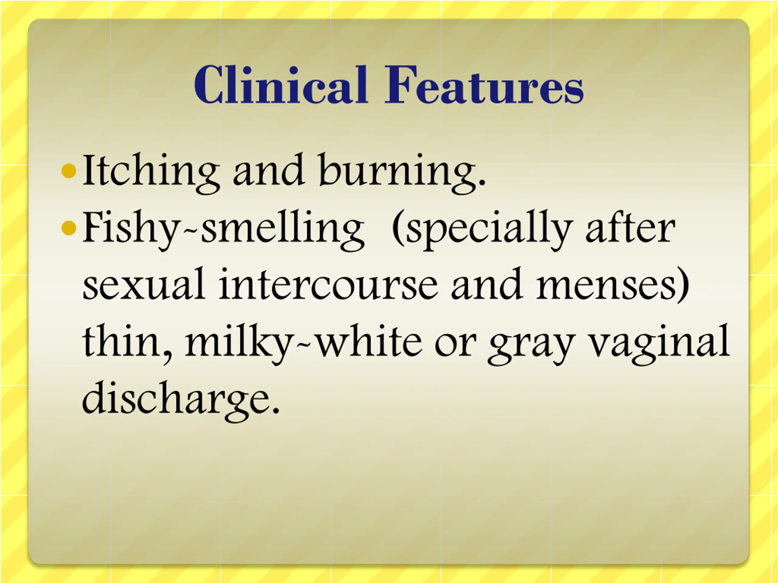 Clinical Features Itching and burning. Fishy-smelling (specially after sexual intercourse and menses) thin, milky-white or gray vaginal discharge.