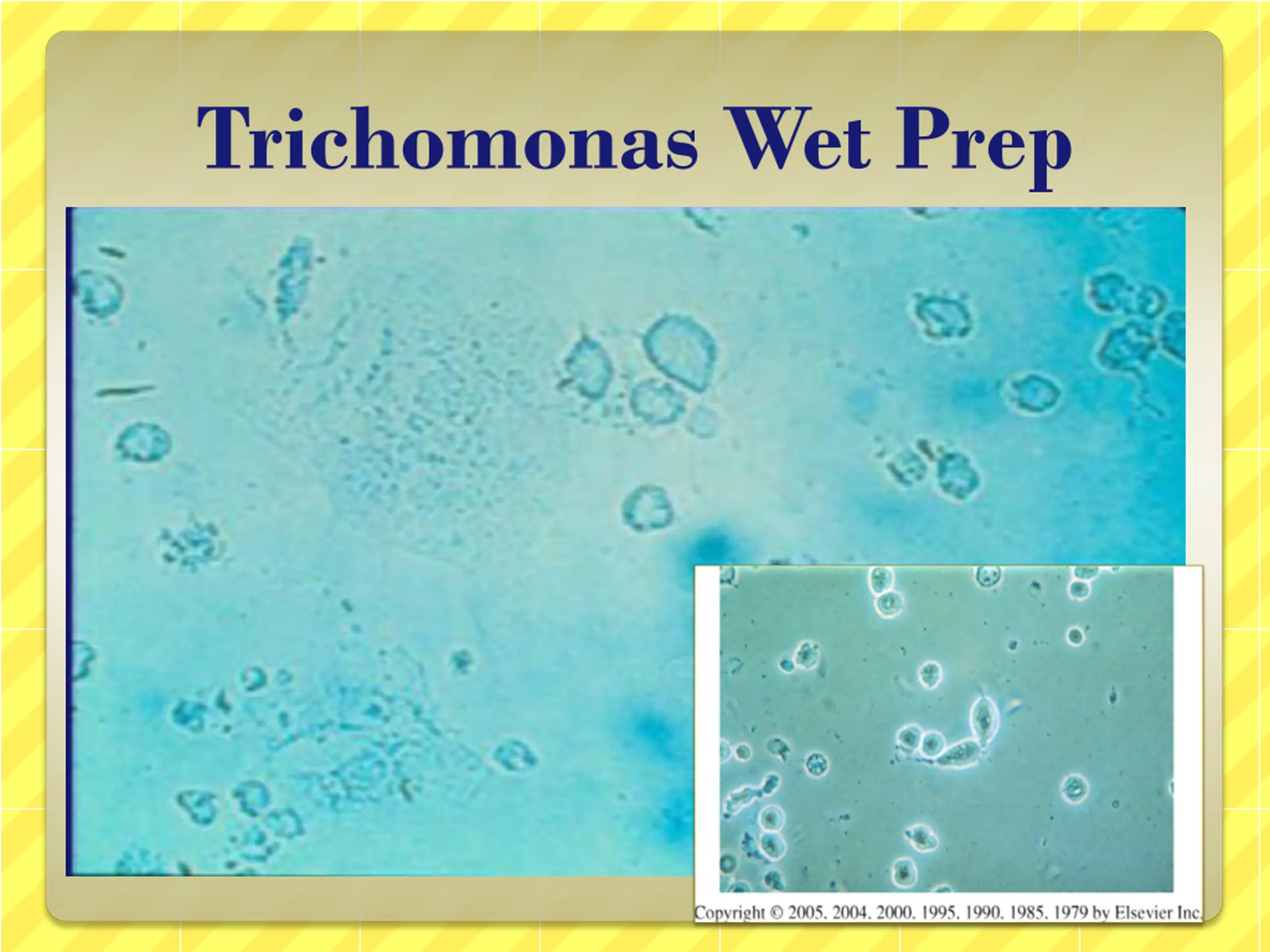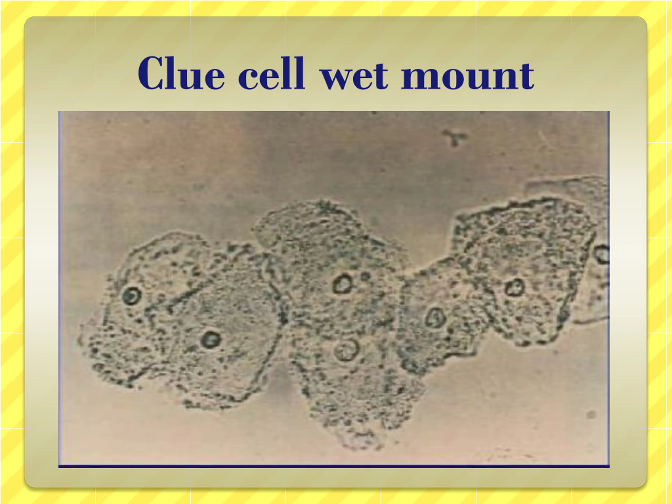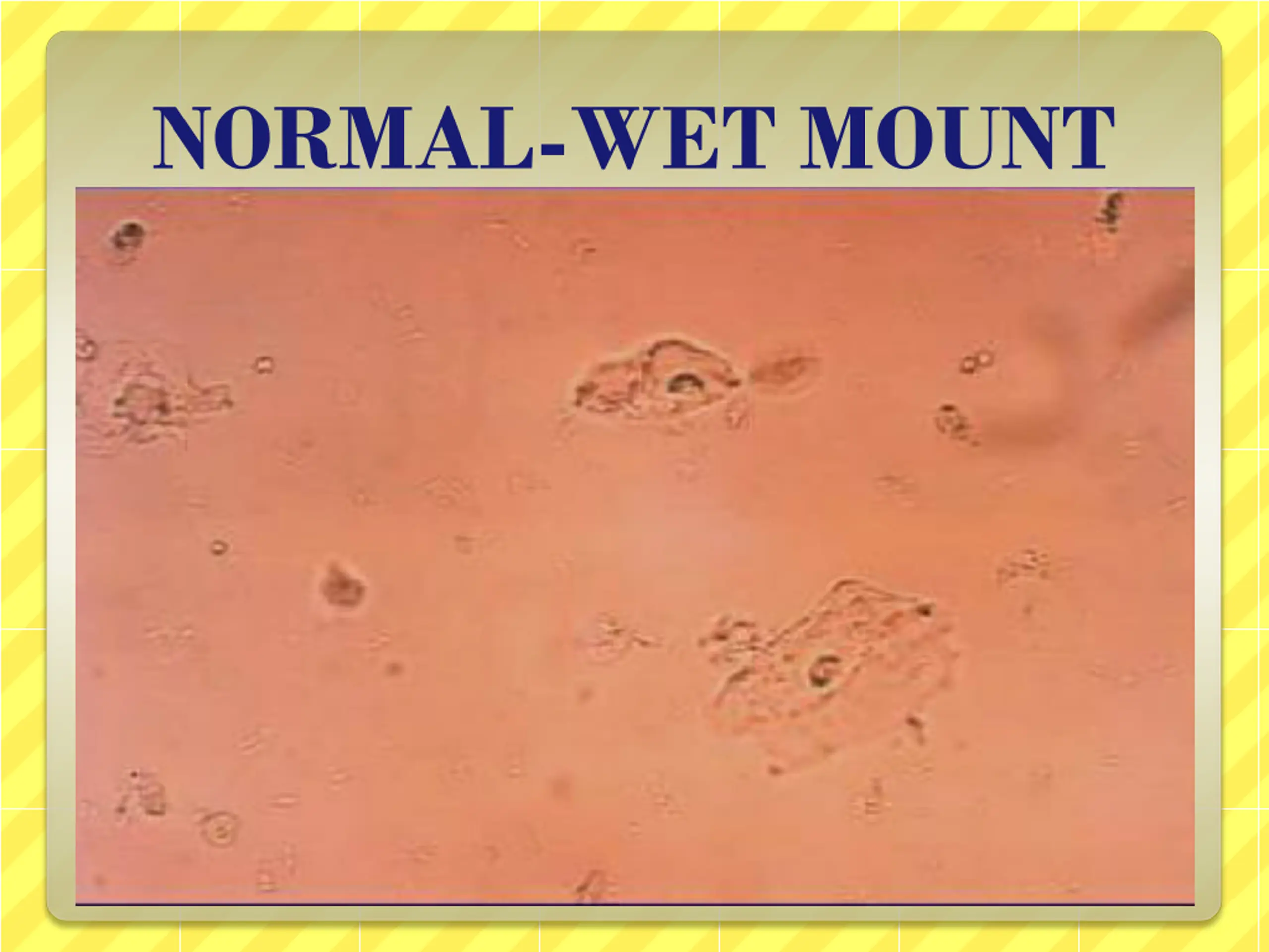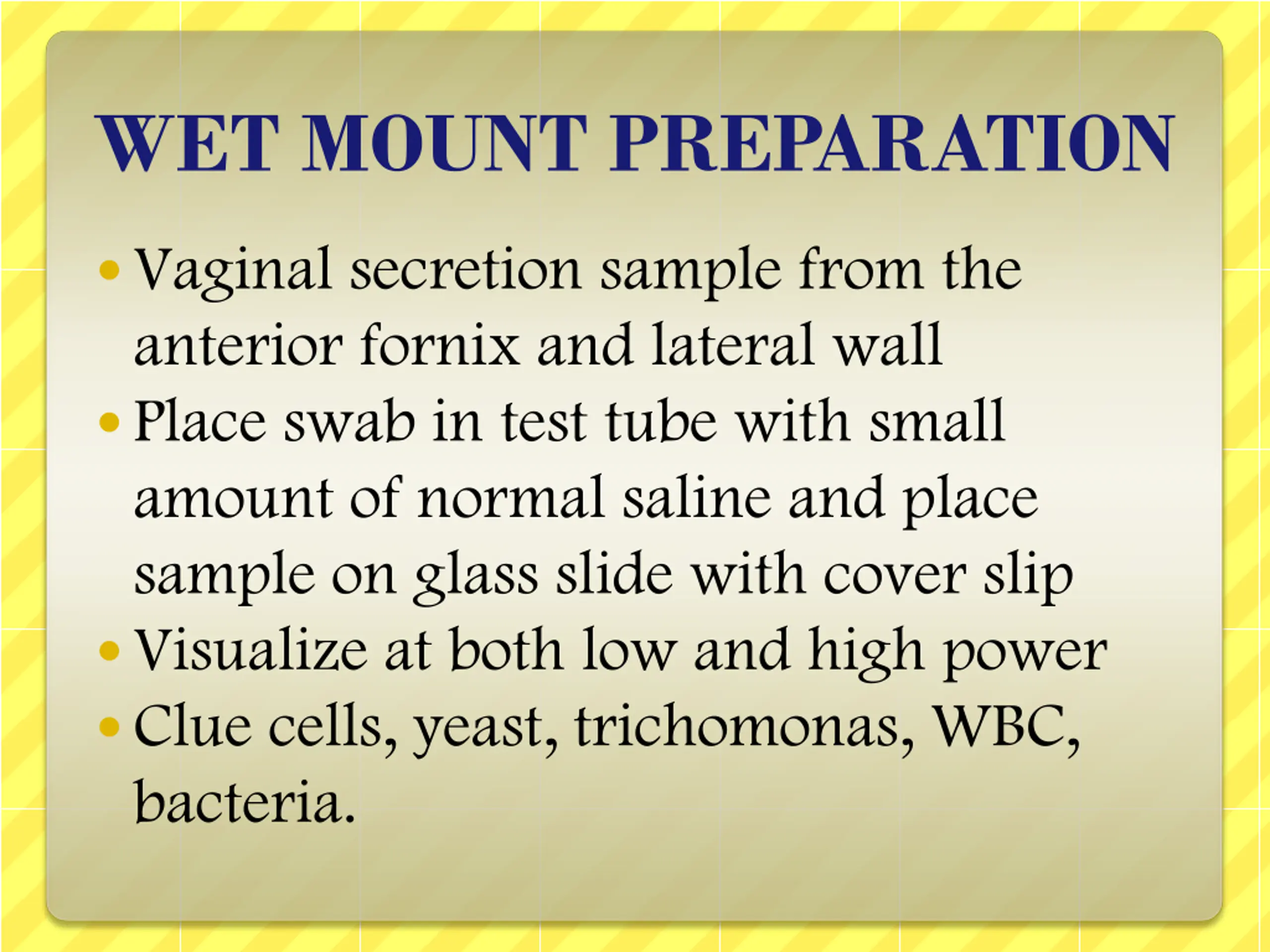 WET MOUNT PREPARATION Vaginal secretion sample from the anterior fornix and lateral wall Place swab in test tube with small amount of normal saline and place sample on glass slide with cover slip Visualize at both low and high power Clue cells, yeast, trichomonas, WBC, bacteria.
