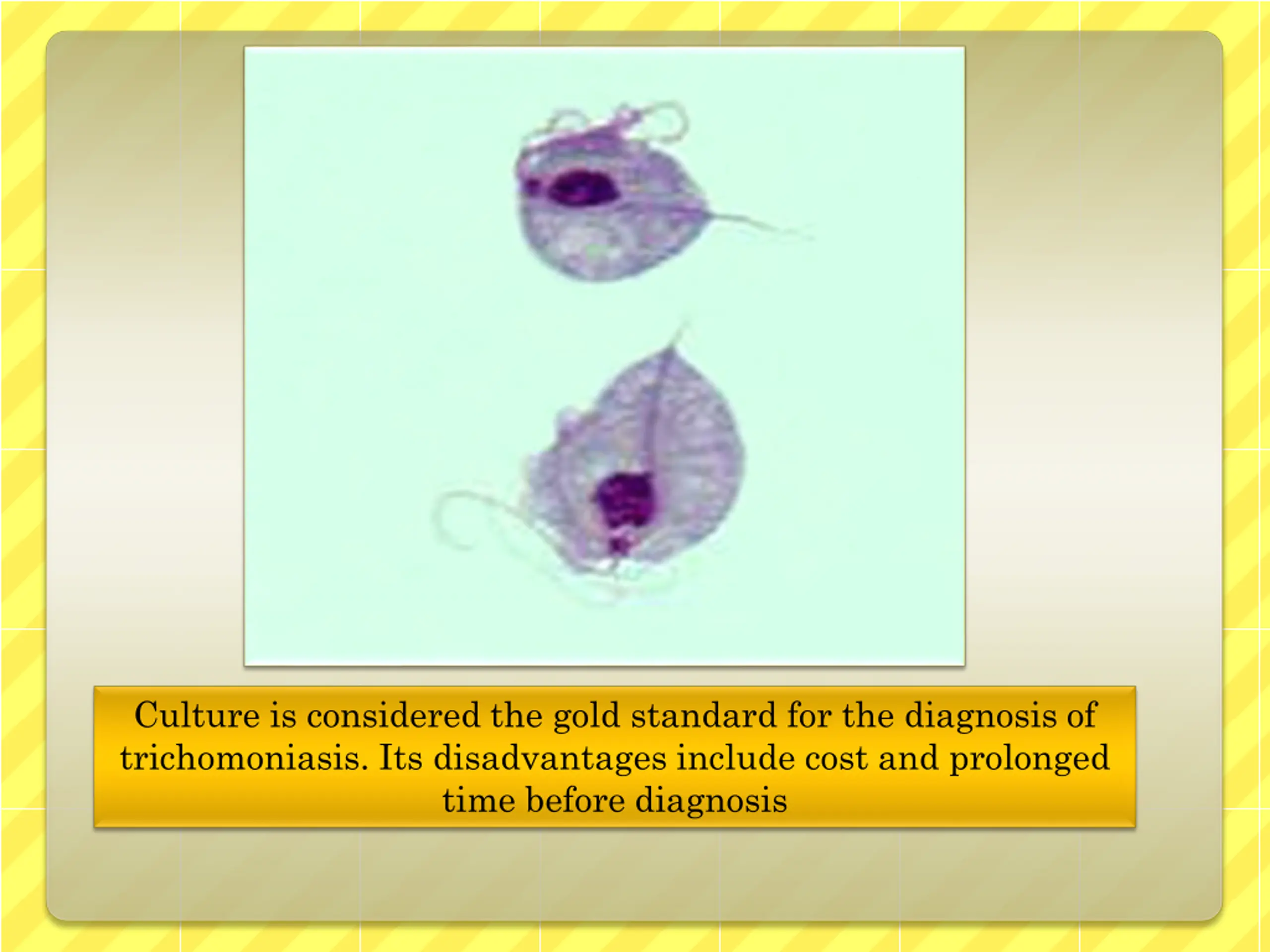 Culture is considered the gold standard for the diagnosis of trichomoniasis. Its disadvantages include cost and prolonged time before diagnosis