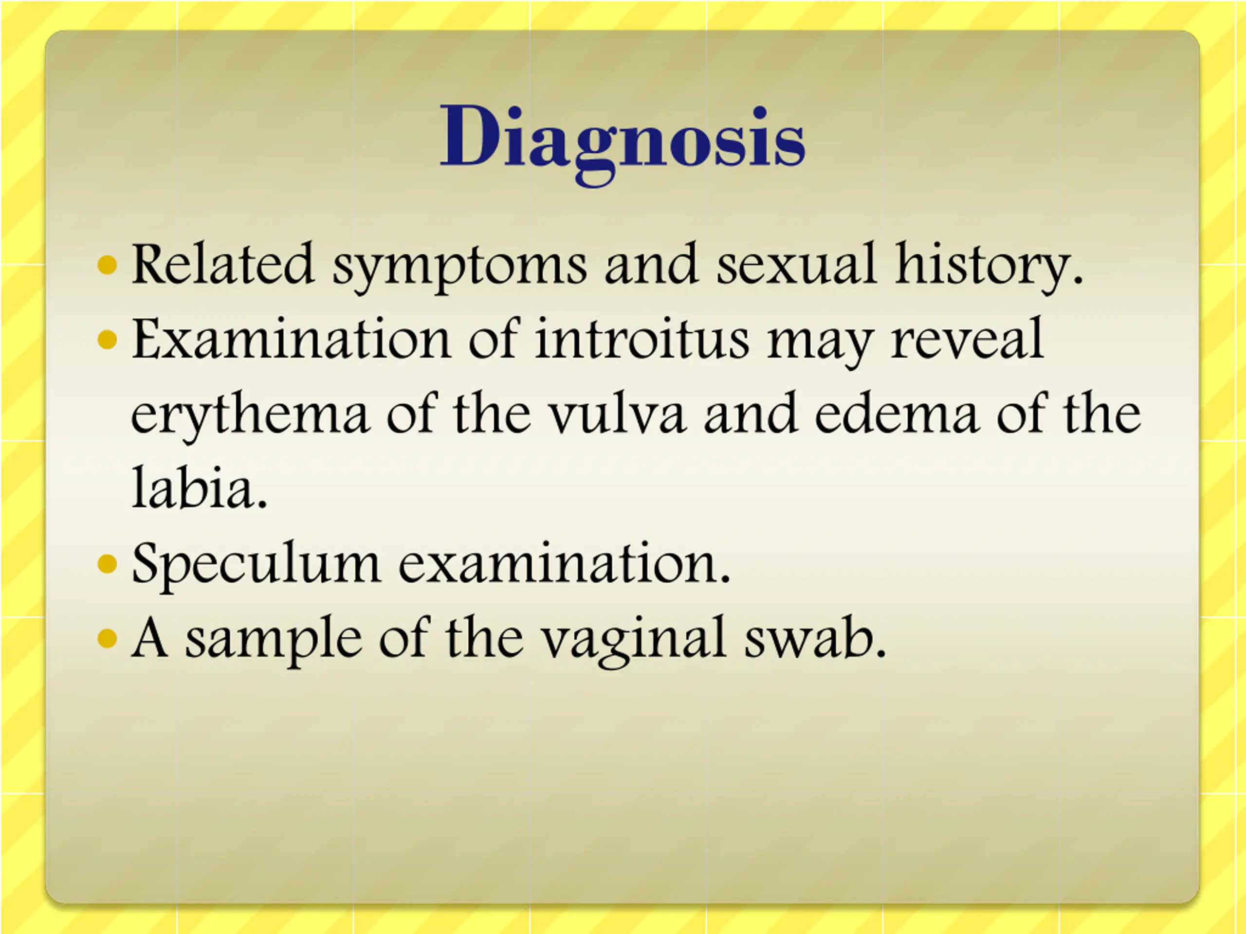 Diagnosis Related symptoms and sexual history. Examination of introitus may reveal erythema of the vulva and edema of the labia. Speculum examination. A sample of the vaginal swab.