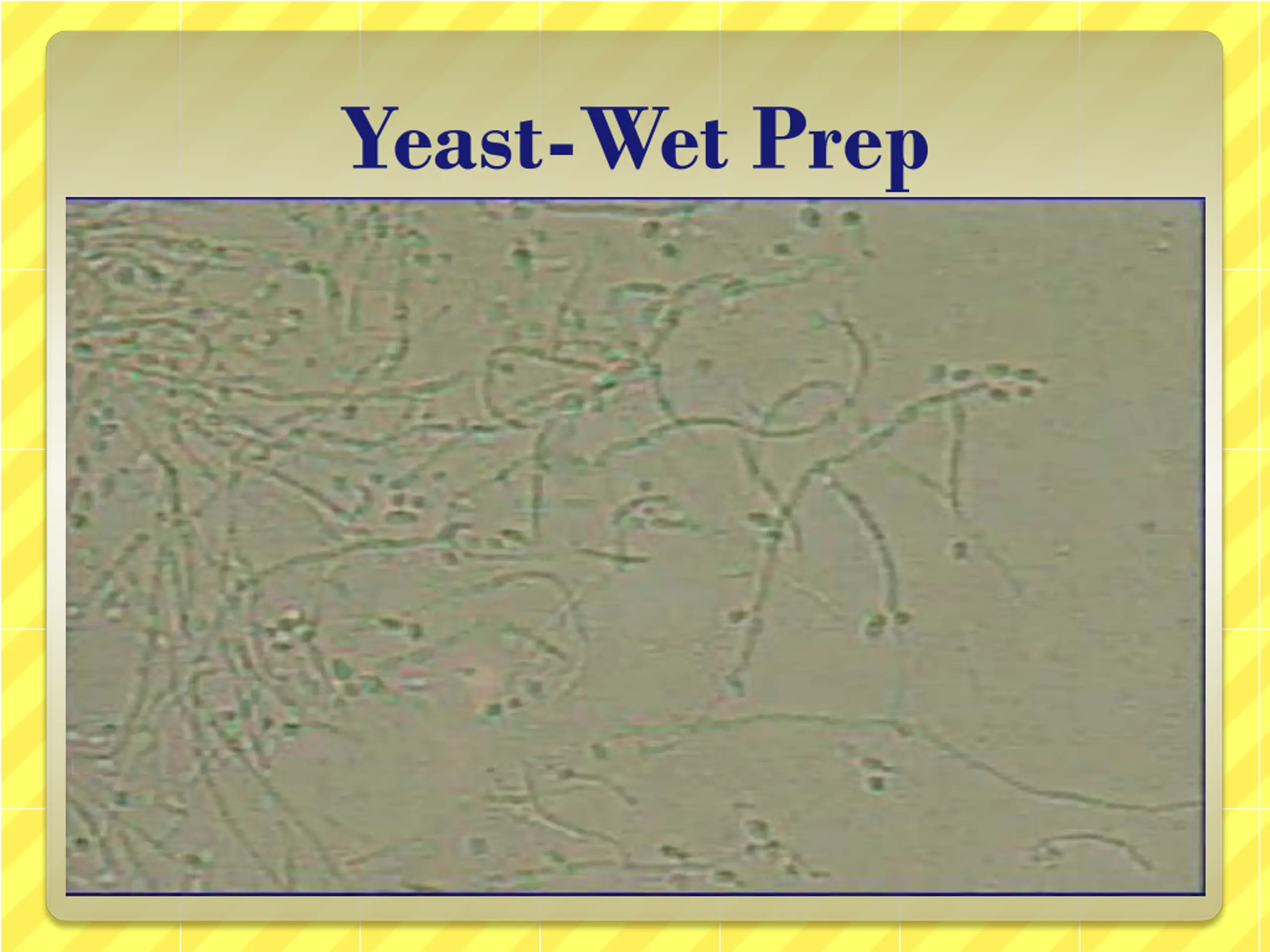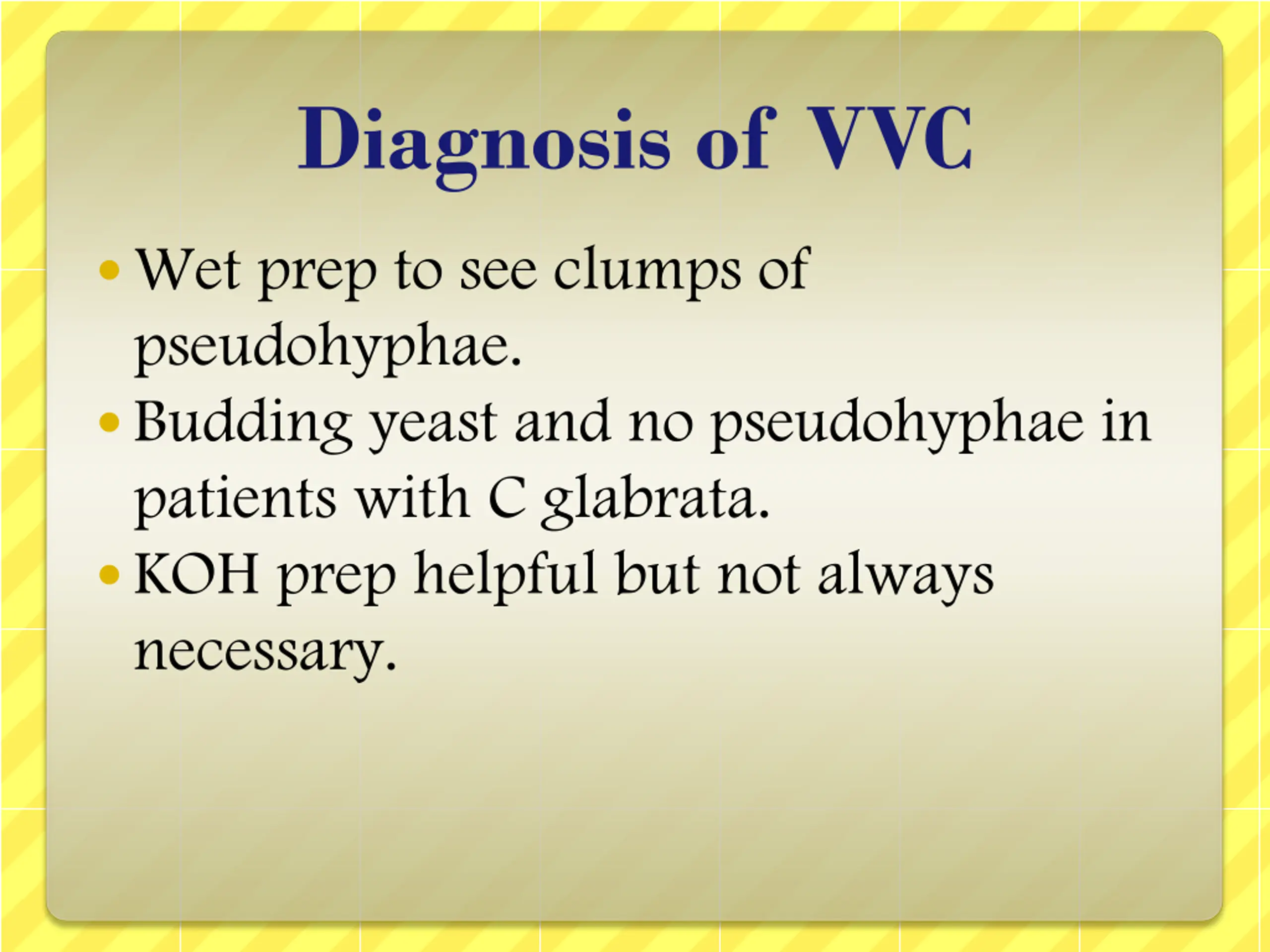 Diagnosis of VVC Wet prep to see clumps of pseudohyphae. Budding yeast and no pseudohyphae in patients with C glabrata. KOH prep helpful but not always necessary.