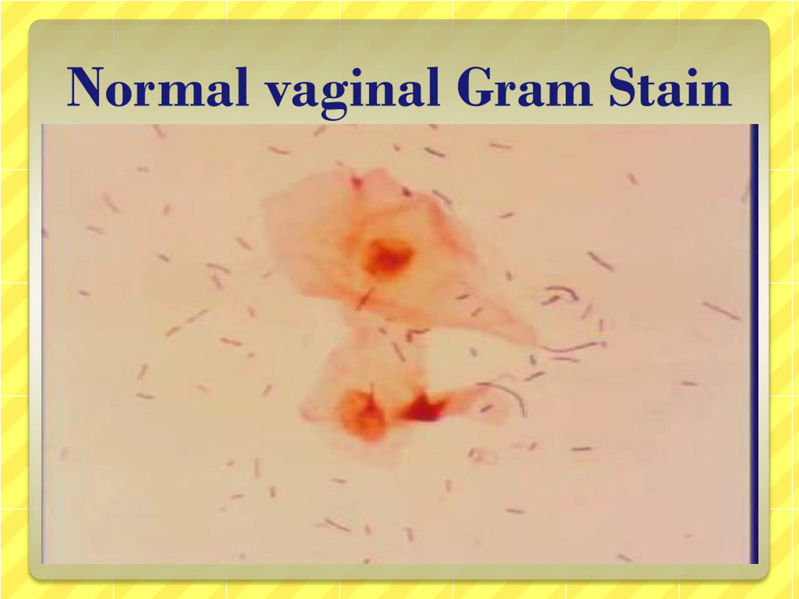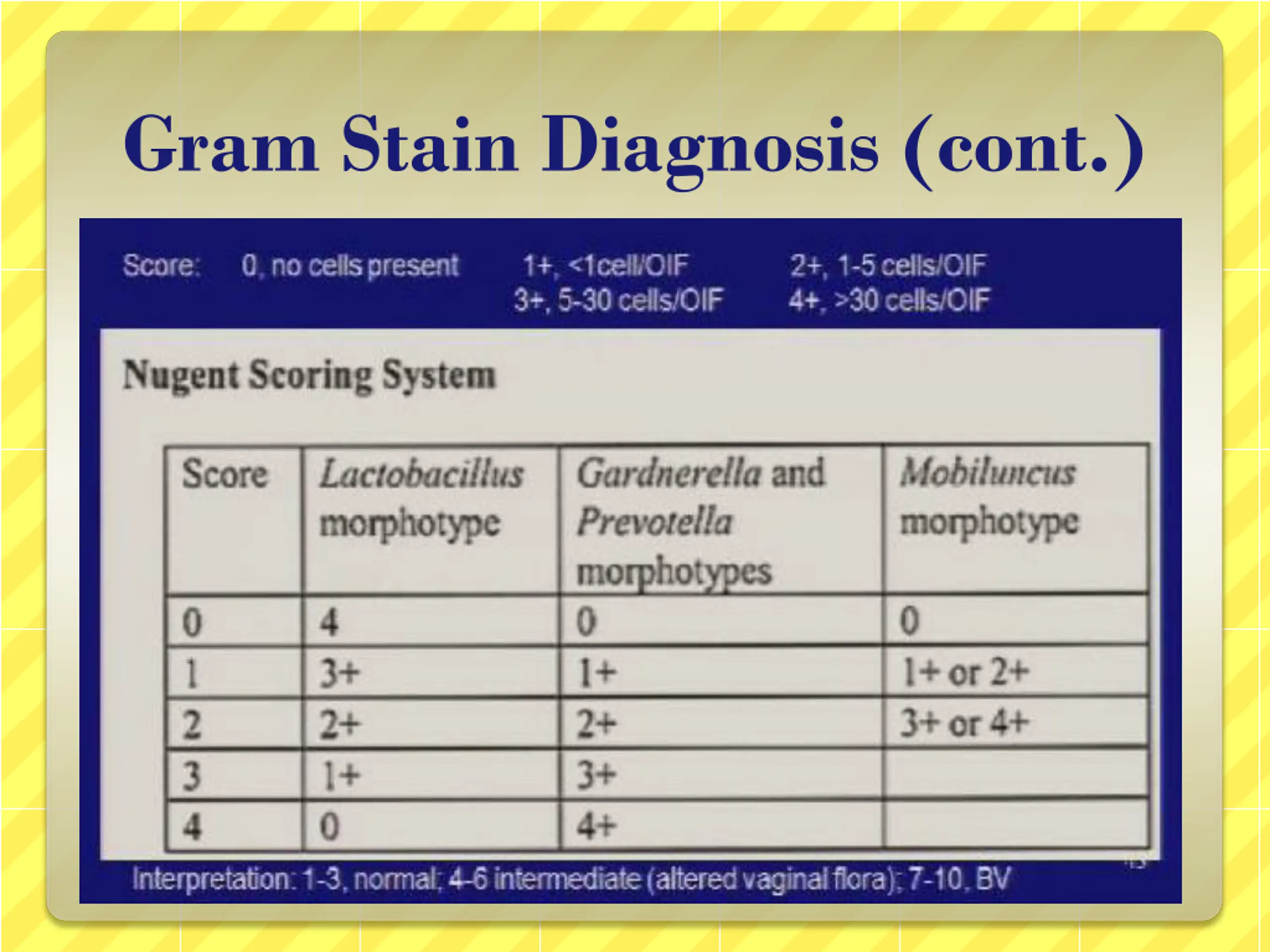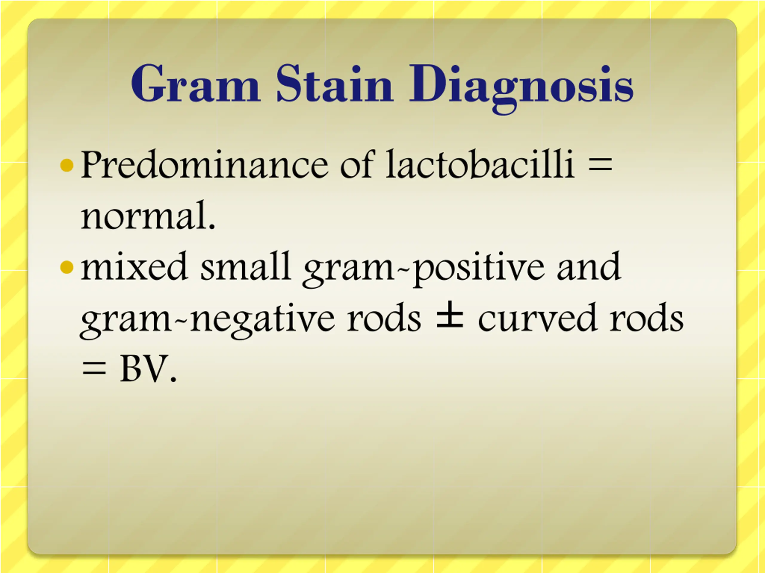 Gram Stain Diagnosis Predominance of lactobacilli = normal. mixed small gram-positive and gram-negative rods curved rods = BV.