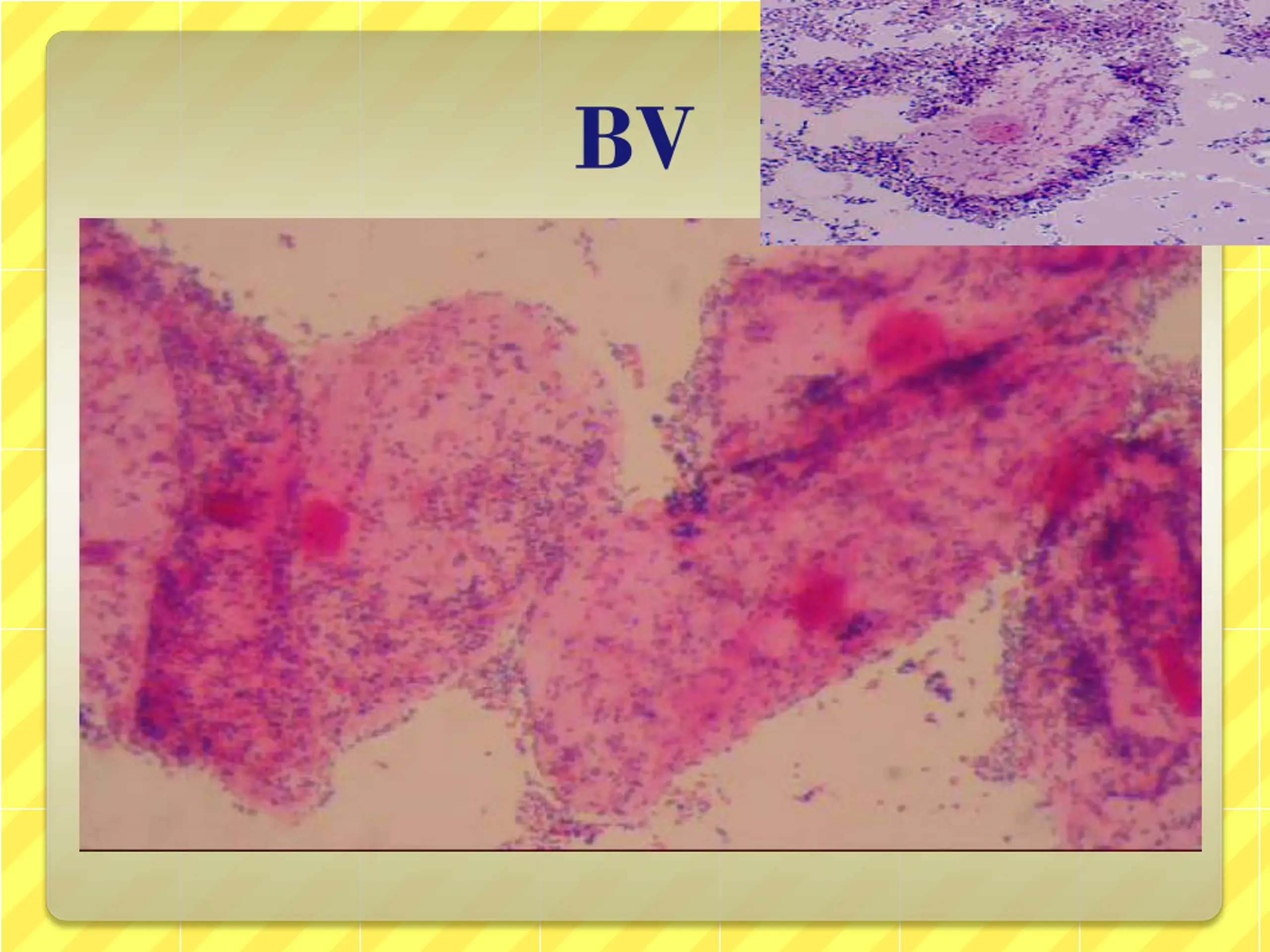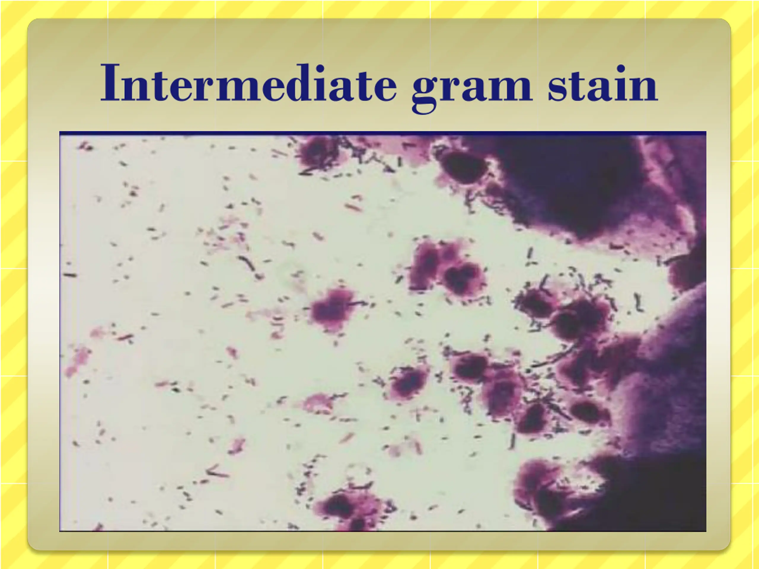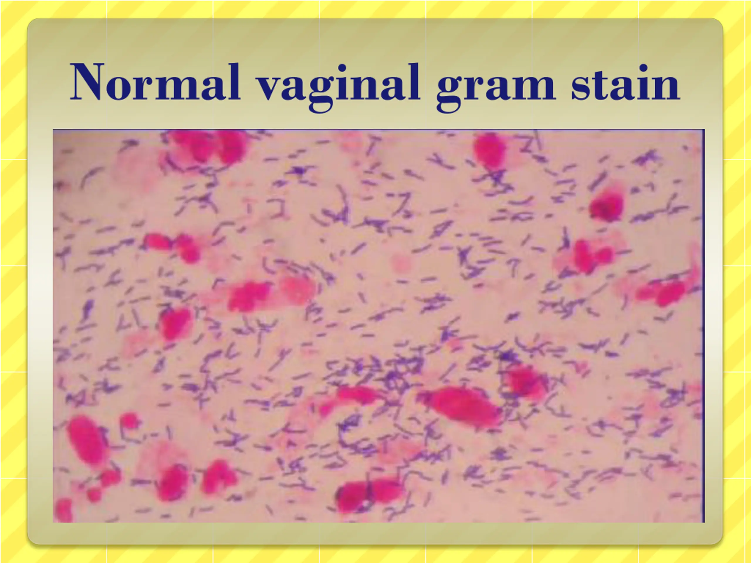 Gram Stain Diagnosis Predominance of lactobacilli = normal. mixed small gram-positive and gram-negative rods curved rods = BV.