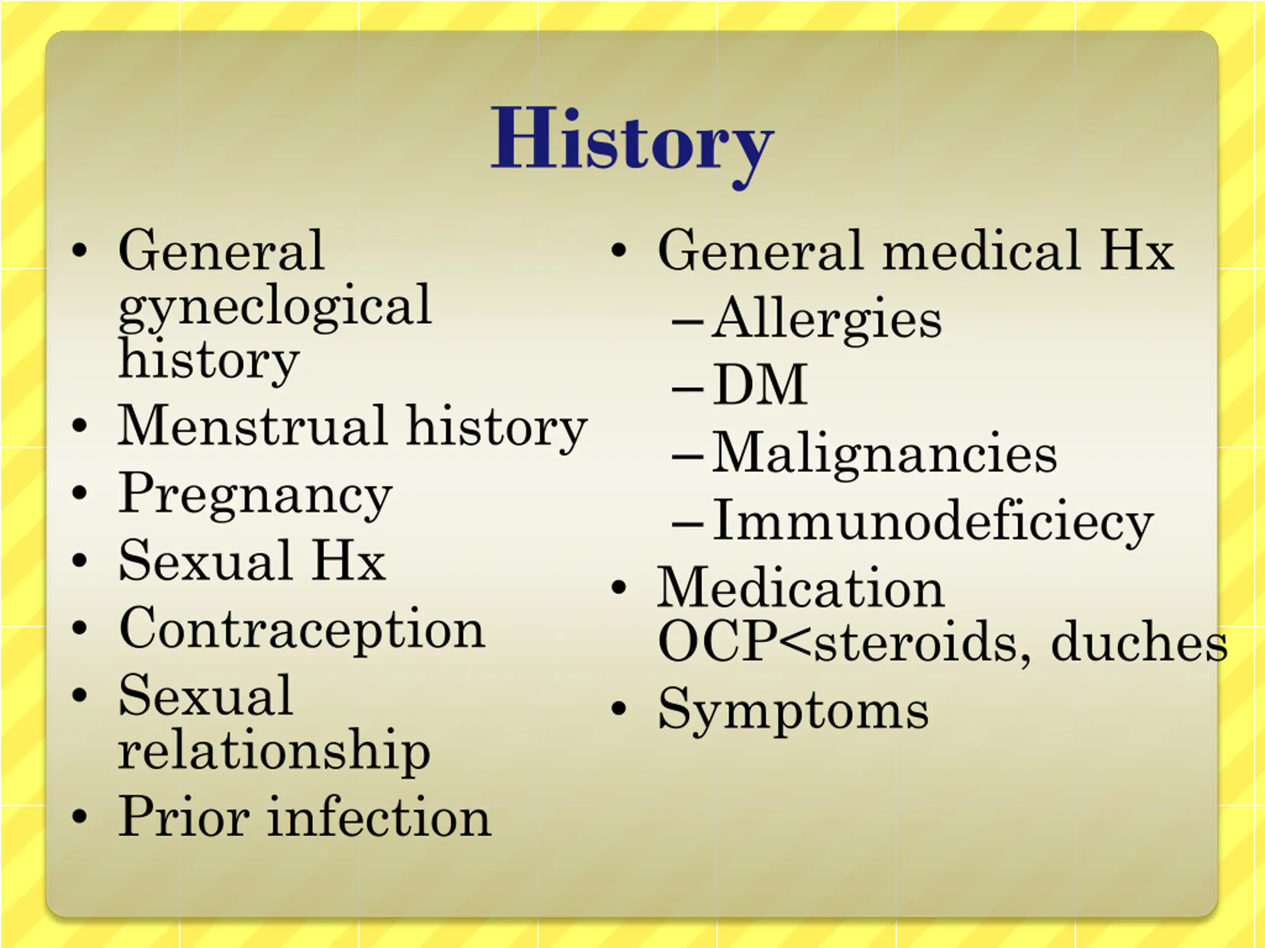 History General medical Hx Allergies DM Malignancies Immunodeficiecy Medication OCP<steroids, duches Symptoms General gyneclogical history Menstrual history Pregnancy Sexual Hx Contraception Sexual relationship Prior infection