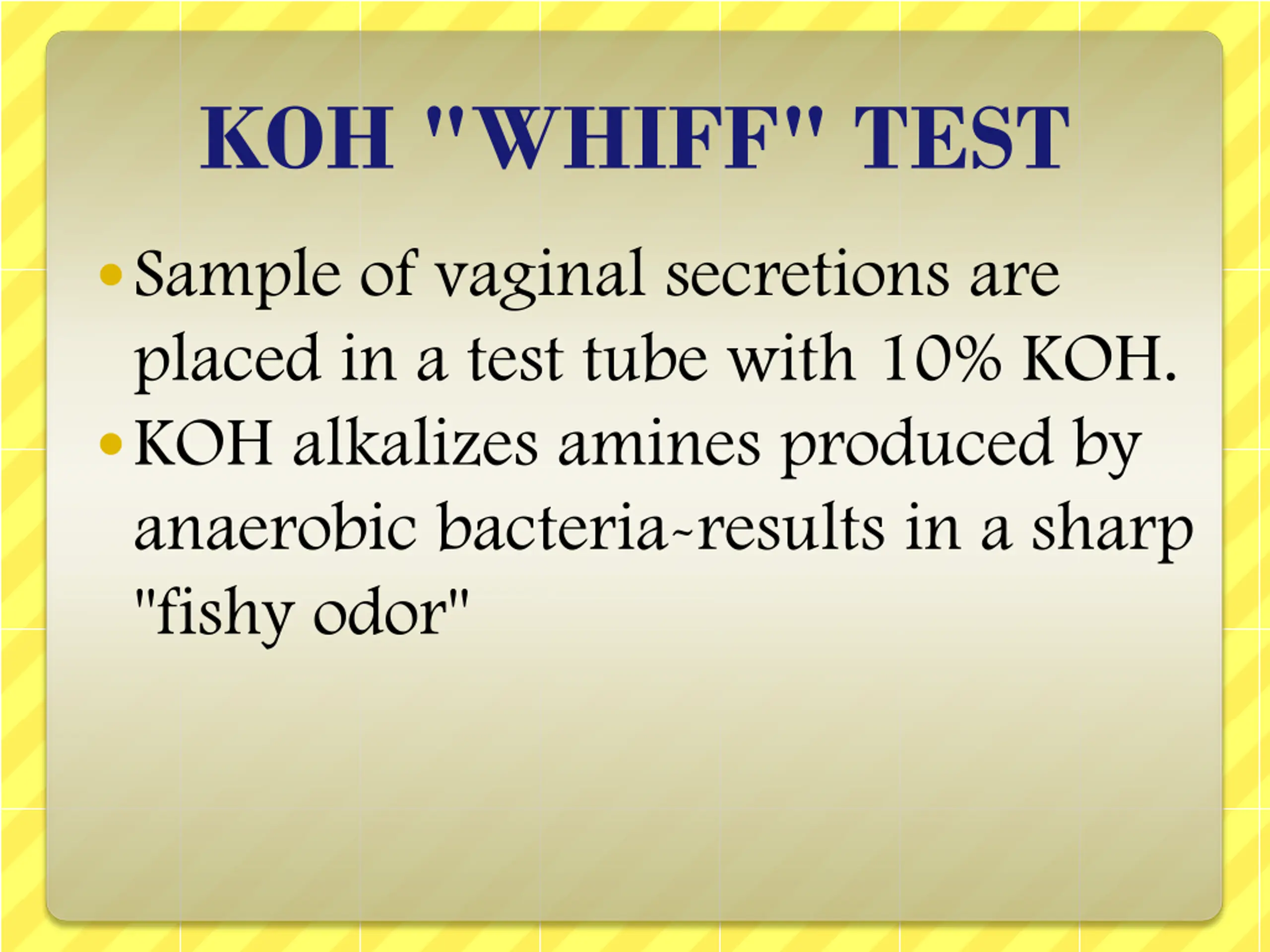 KOH "WHIFF" TEST Sample of vaginal secretions are placed in a test tube with 10% KOH. KOH alkalizes amines produced by anaerobic bacteria-results in a sharp "fishy odor"