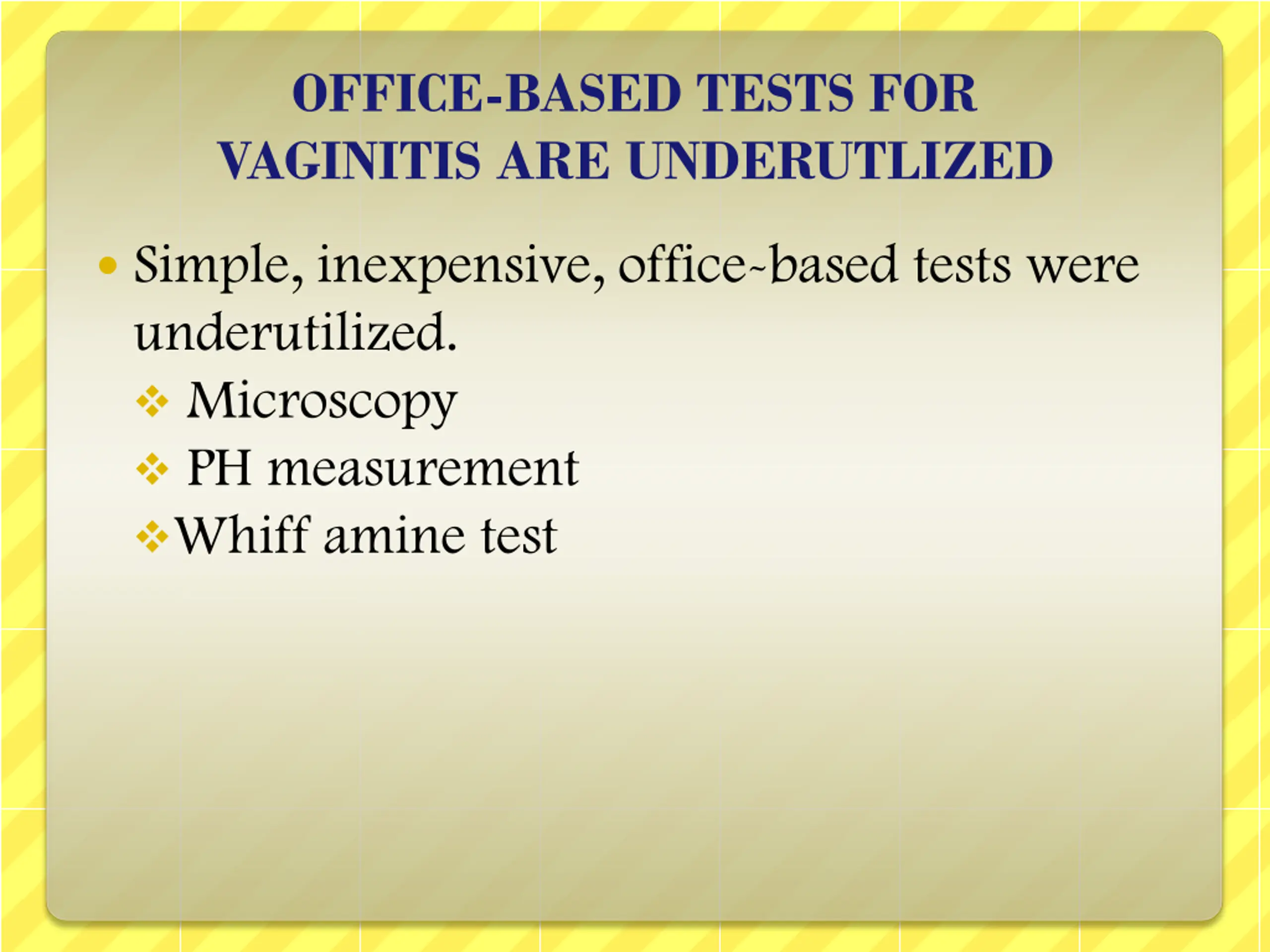 OFFICE-BASED TESTS FOR VAGINITIS ARE UNDERUTLIZED Simple, inexpensive, office-based tests were underutilized. Microscopy PH measurement Whiff amine test