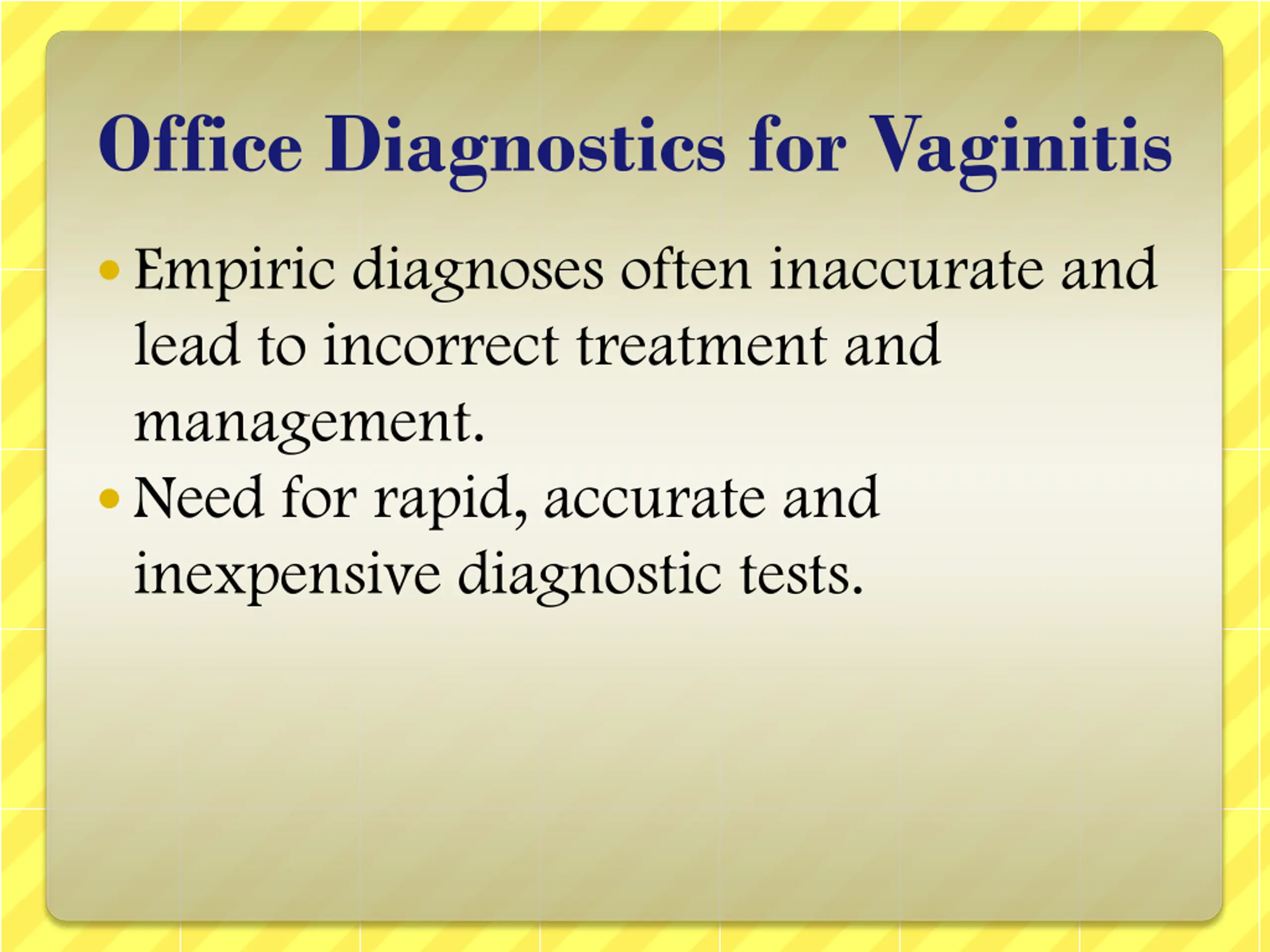Office Diagnostics for Vaginitis Empiric diagnoses often inaccurate and lead to incorrect treatment and management. Need for rapid, accurate and inexpensive diagnostic tests.