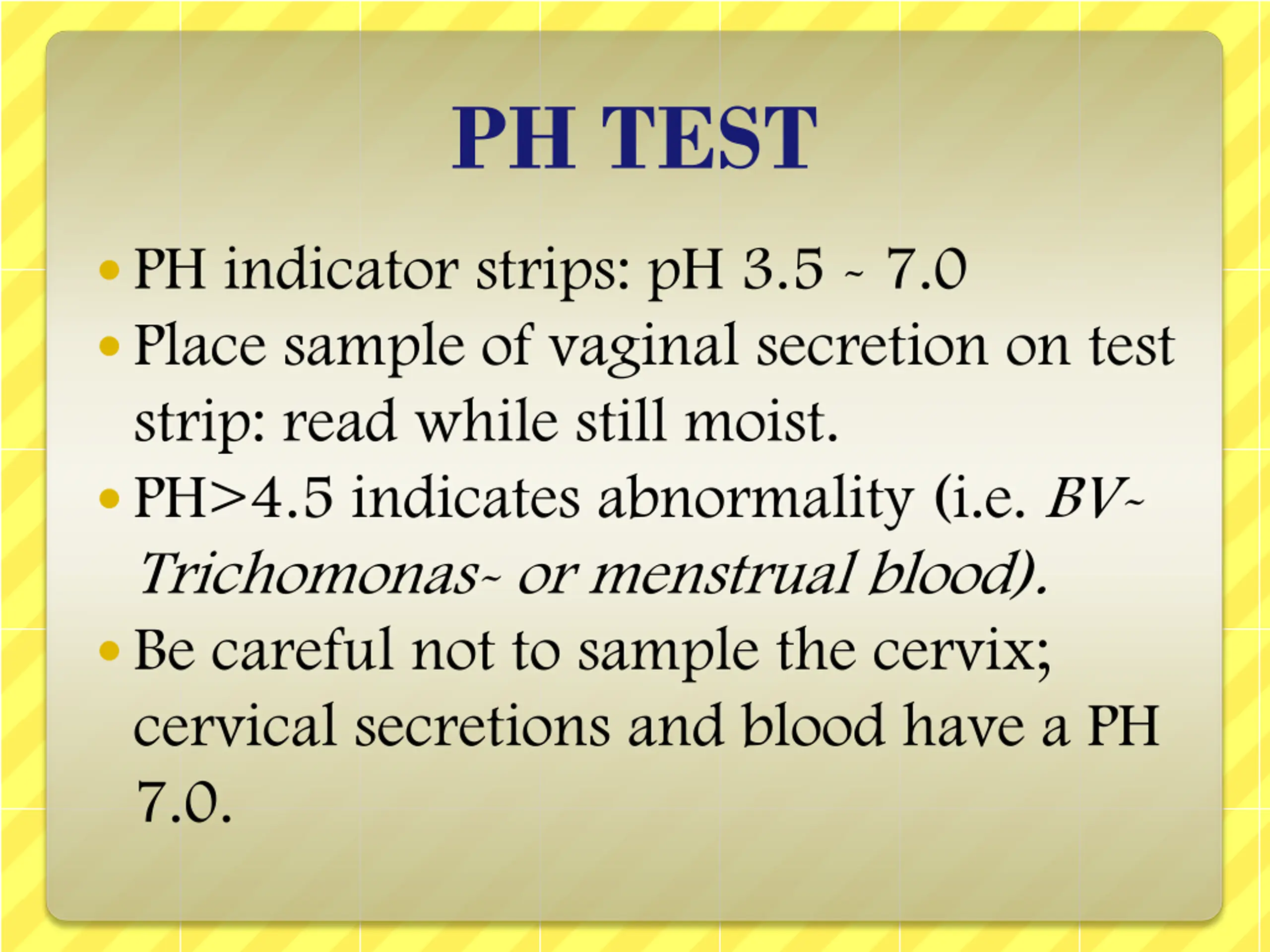PH TEST PH indicator strips: pH 3.5 - 7.0 Place sample of vaginal secretion on test strip: read while still moist. PH>4.5 indicates abnormality (i.e. BV- Trichomonas- or menstrual blood). Be careful not to sample the cervix; cervical secretions and blood have a PH 7.0.