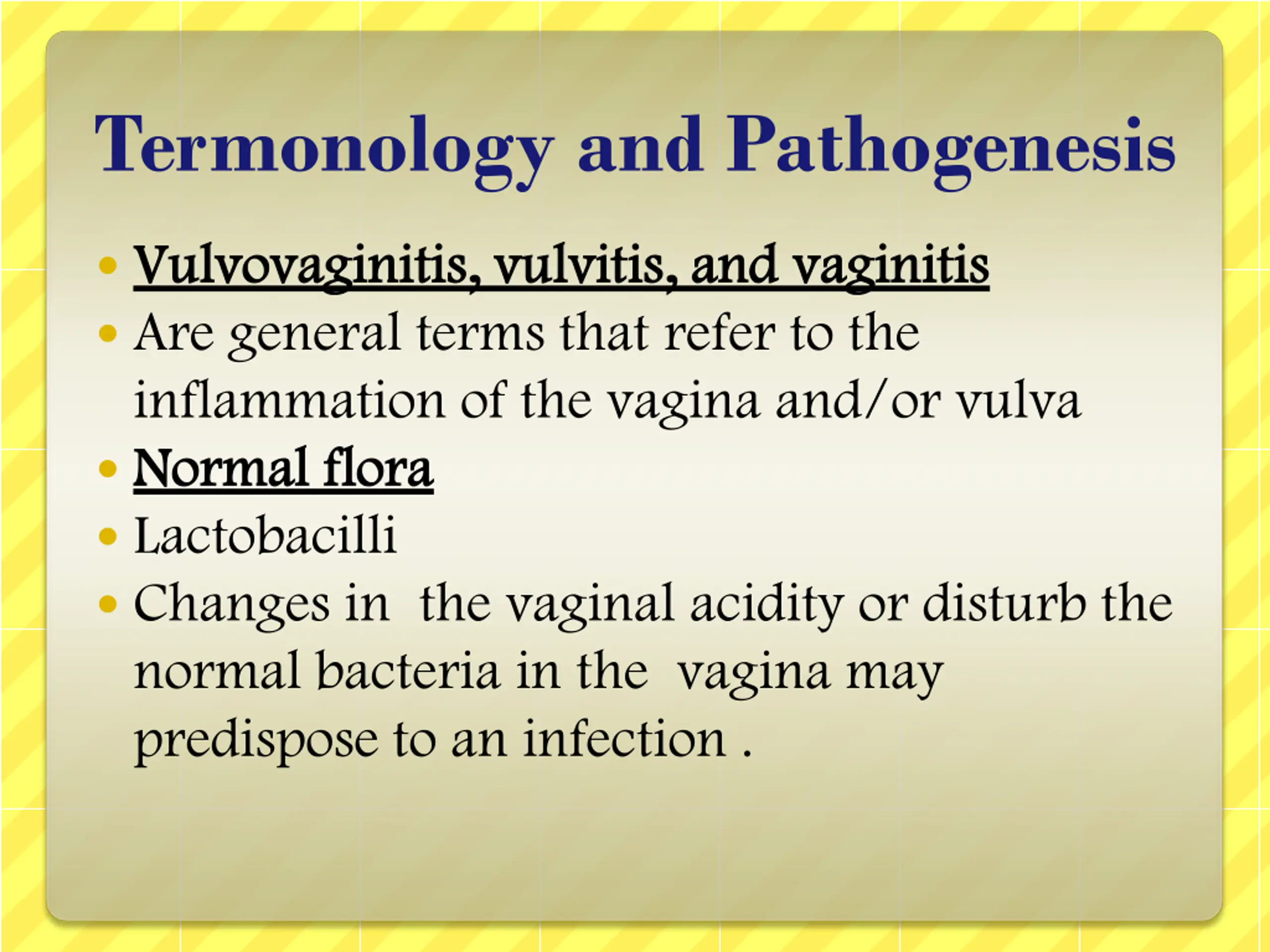 Termonology and Pathogenesis Vulvovaginitis Vulvovaginitis, , vulvitis Are general terms that refer to the inflammation of the vagina and/or vulva Normal flora Normal flora Lactobacilli Changes in the vaginal acidity or disturb the normal bacteria in the vagina may predispose to an infection . vulvitis, and , and vaginitis vaginitis