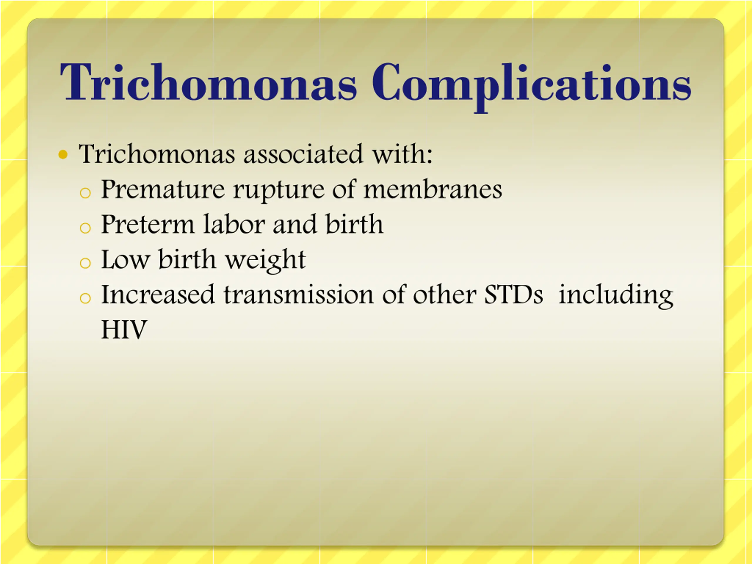 Trichomonas Complications Trichomonas associated with: o Premature rupture of membranes o Preterm labor and birth o Low birth weight o Increased transmission of other STDs including HIV