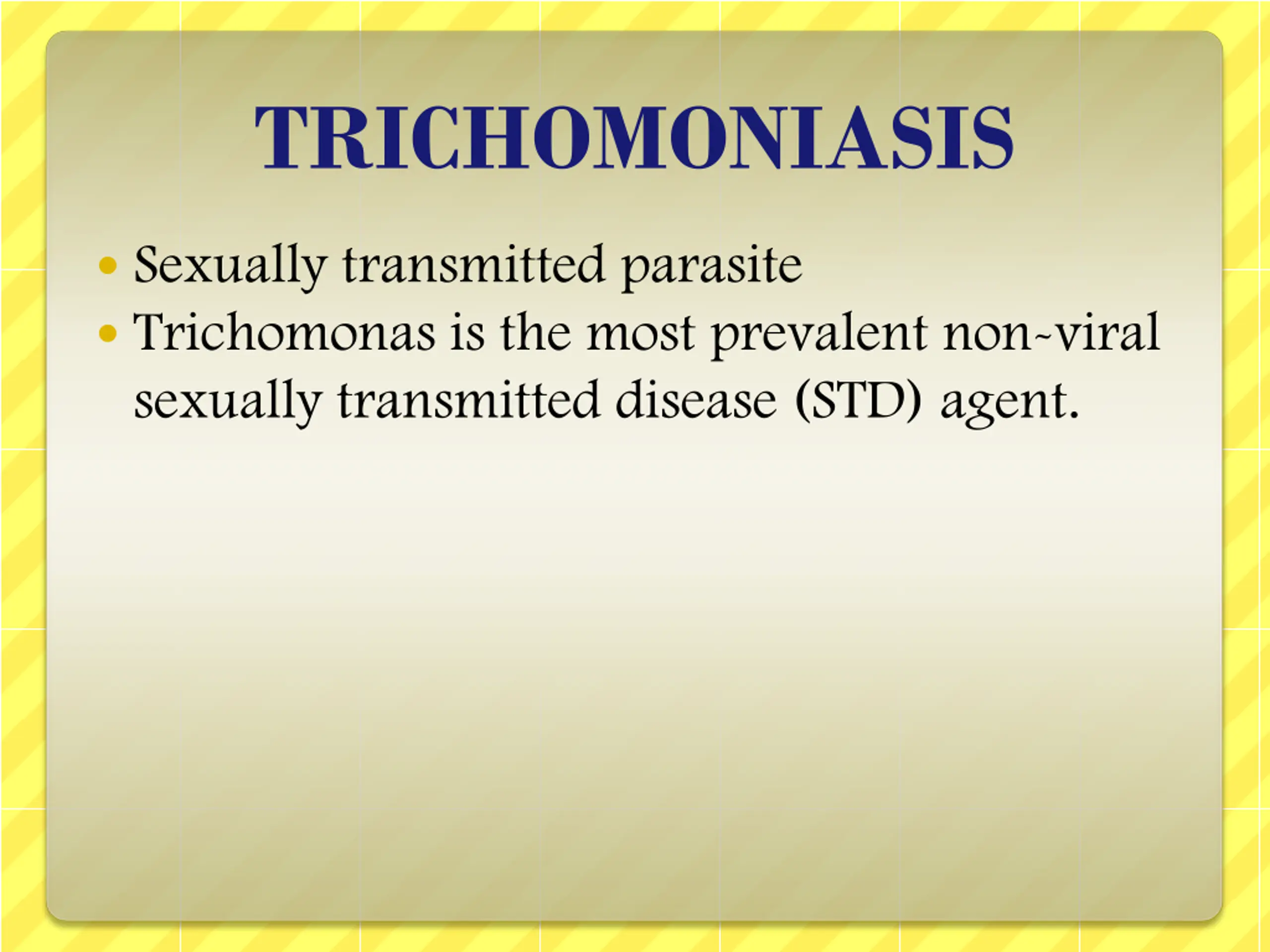 TRICHOMONIASIS Sexually transmitted parasite Trichomonas is the most prevalent non-viral sexually transmitted disease (STD) agent.