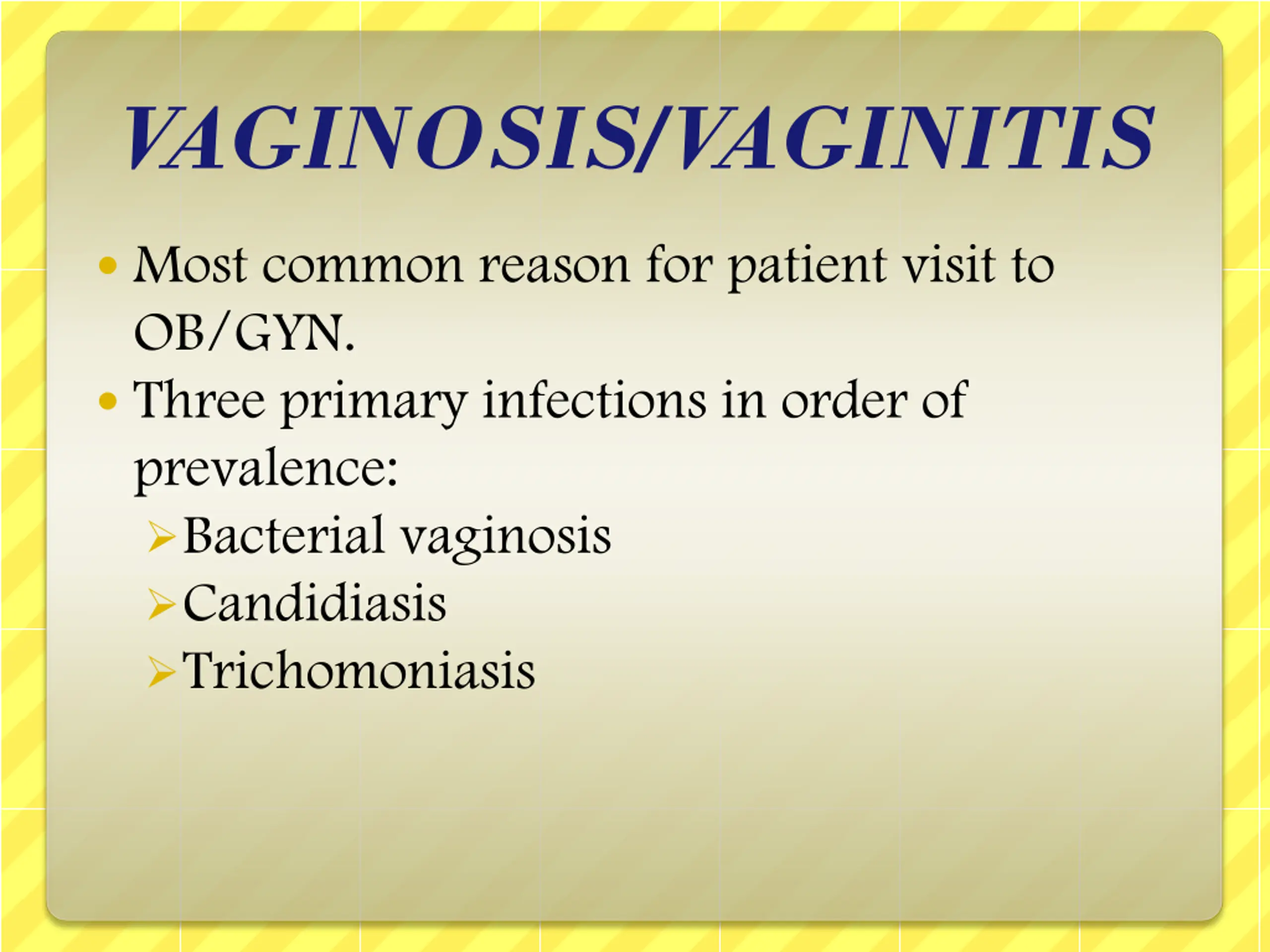 V AGINOSIS/V AGINITIS Most common reason for patient visit to OB/GYN. Three primary infections in order of prevalence: Bacterial vaginosis Candidiasis Trichomoniasis