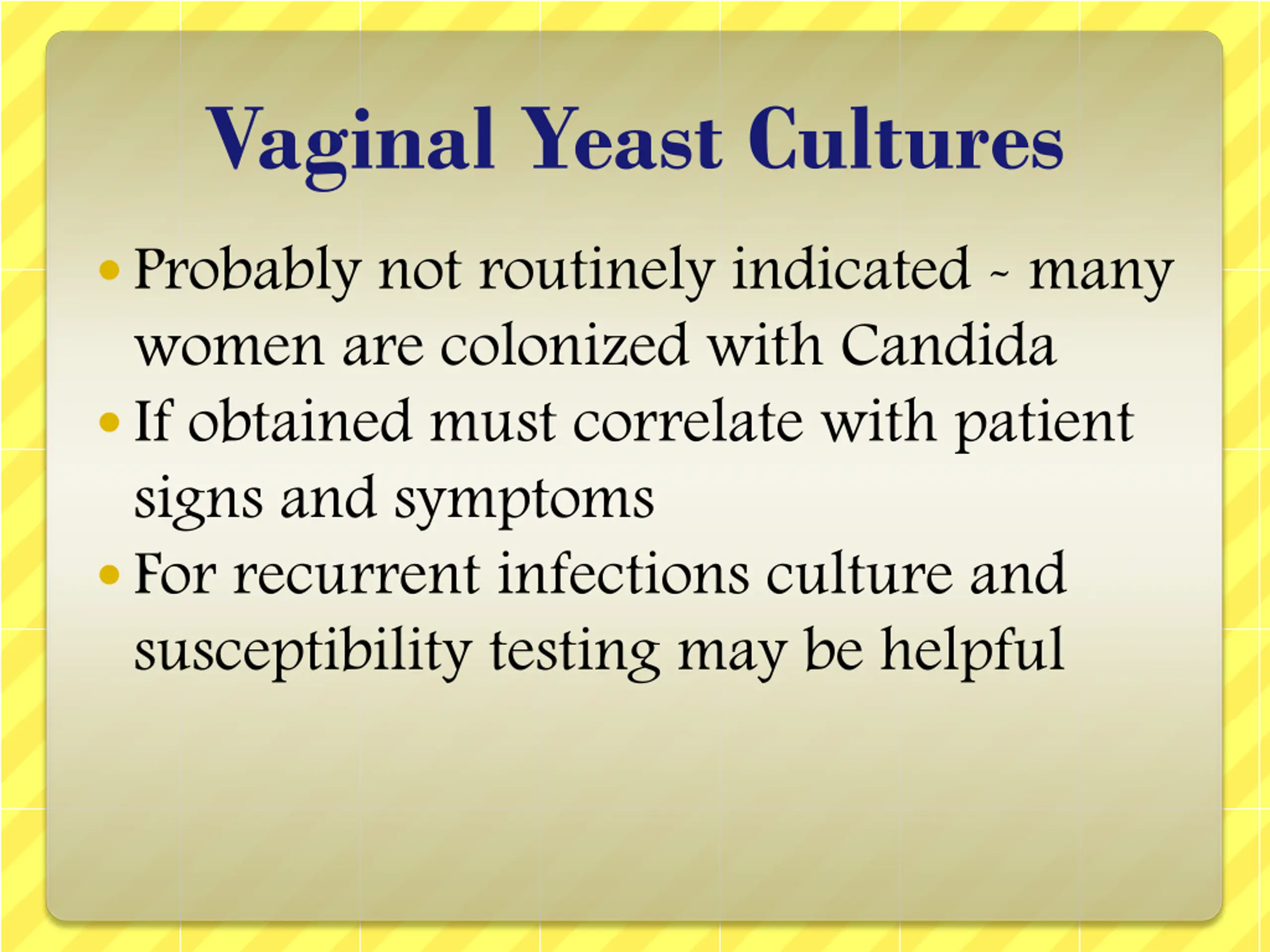 Vaginal Yeast Cultures Probably not routinely indicated - many women are colonized with Candida If obtained must correlate with patient signs and symptoms For recurrent infections culture and susceptibility testing may be helpful