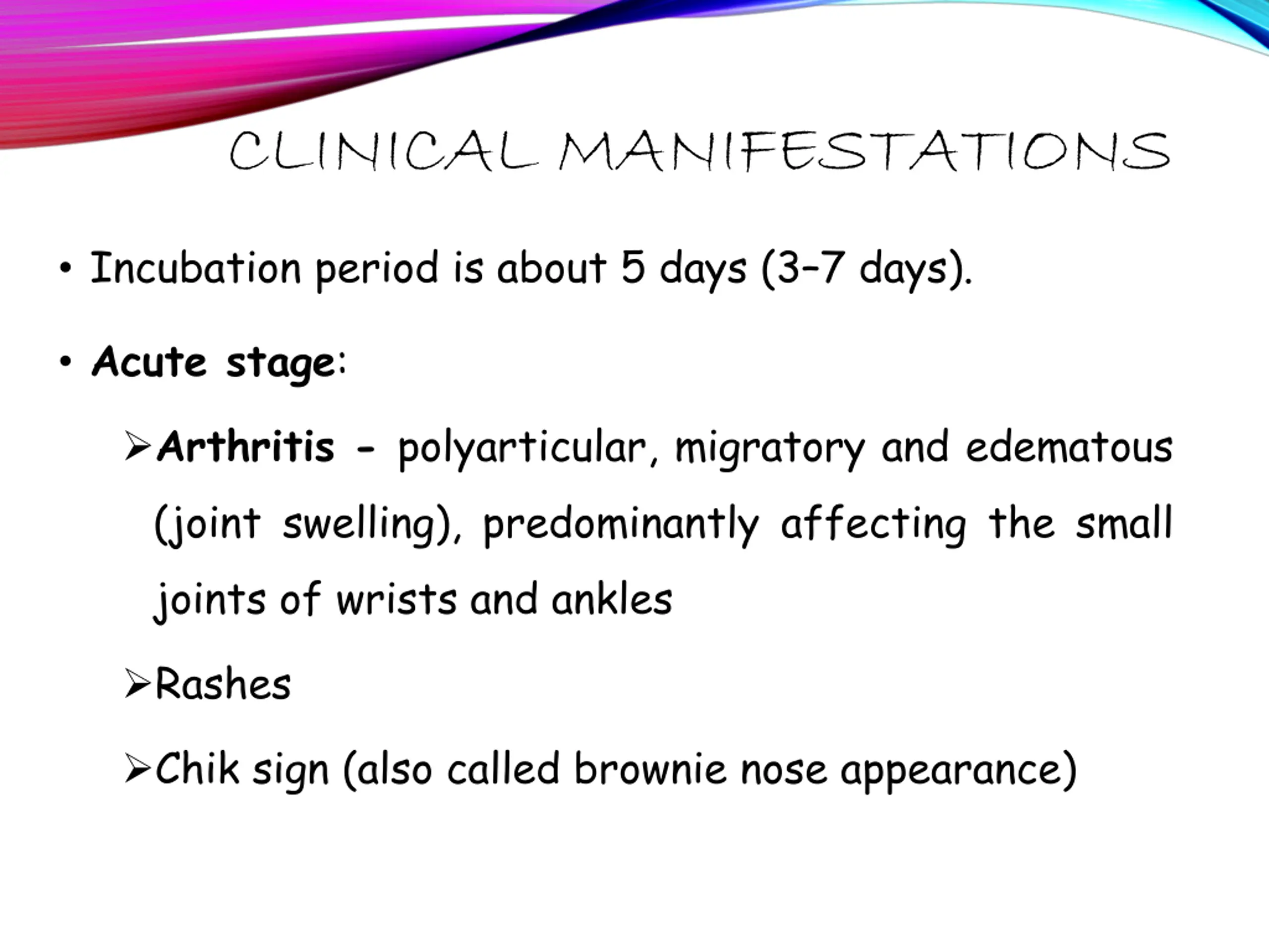 CLINICAL MANIFESTATIONS Incubation period is about 5 days (3 7 days). Acute stage: Arthritis - polyarticular, migratory and edematous (joint swelling), predominantly affecting the small joints of wrists and ankles Rashes Chik sign (also called brownie nose appearance)