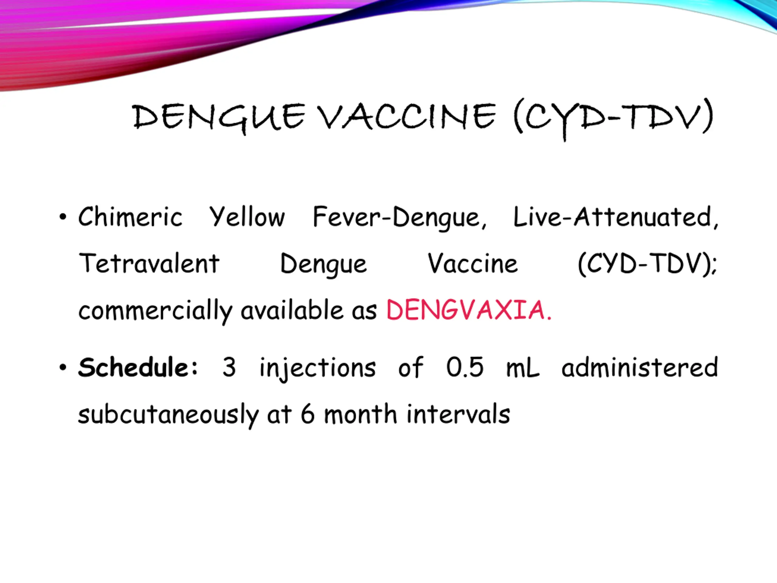 DENGUE VACCINE (CYD DENGUE VACCINE (CYD- -TDV) TDV) Chimeric Tetravalent commercially available as DENGVAXIA. Yellow Fever-Dengue, Dengue Live-Attenuated, Vaccine (CYD-TDV); Schedule: 3 injections of 0.5 mL administered subcutaneously at 6 month intervals