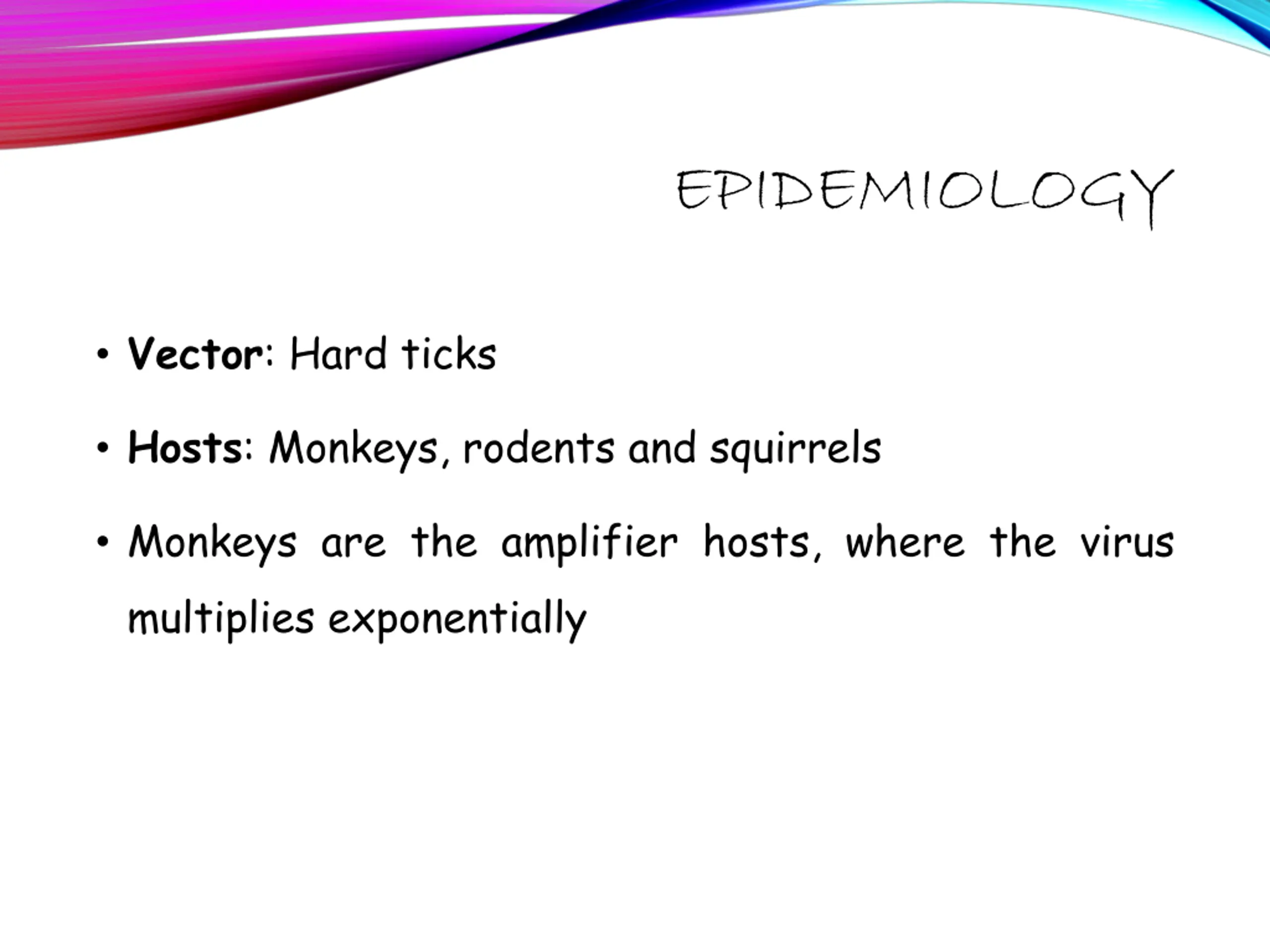 EPIDEMIOLOGY Vector: Hard ticks Hosts: Monkeys, rodents and squirrels Monkeys are the amplifier hosts, where the virus multiplies exponentially